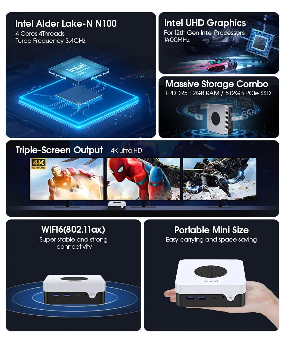 - Soporte de pantalla triple 4K... El PC Gaming tiene un potente Intel N100 Graphics con una frecuencia de hasta 1400MHz, funciona como Streamer multimedia 4K, servidor multimedia doméstico, juegos en línea, edición de fotos, servidores pequeños, etc.