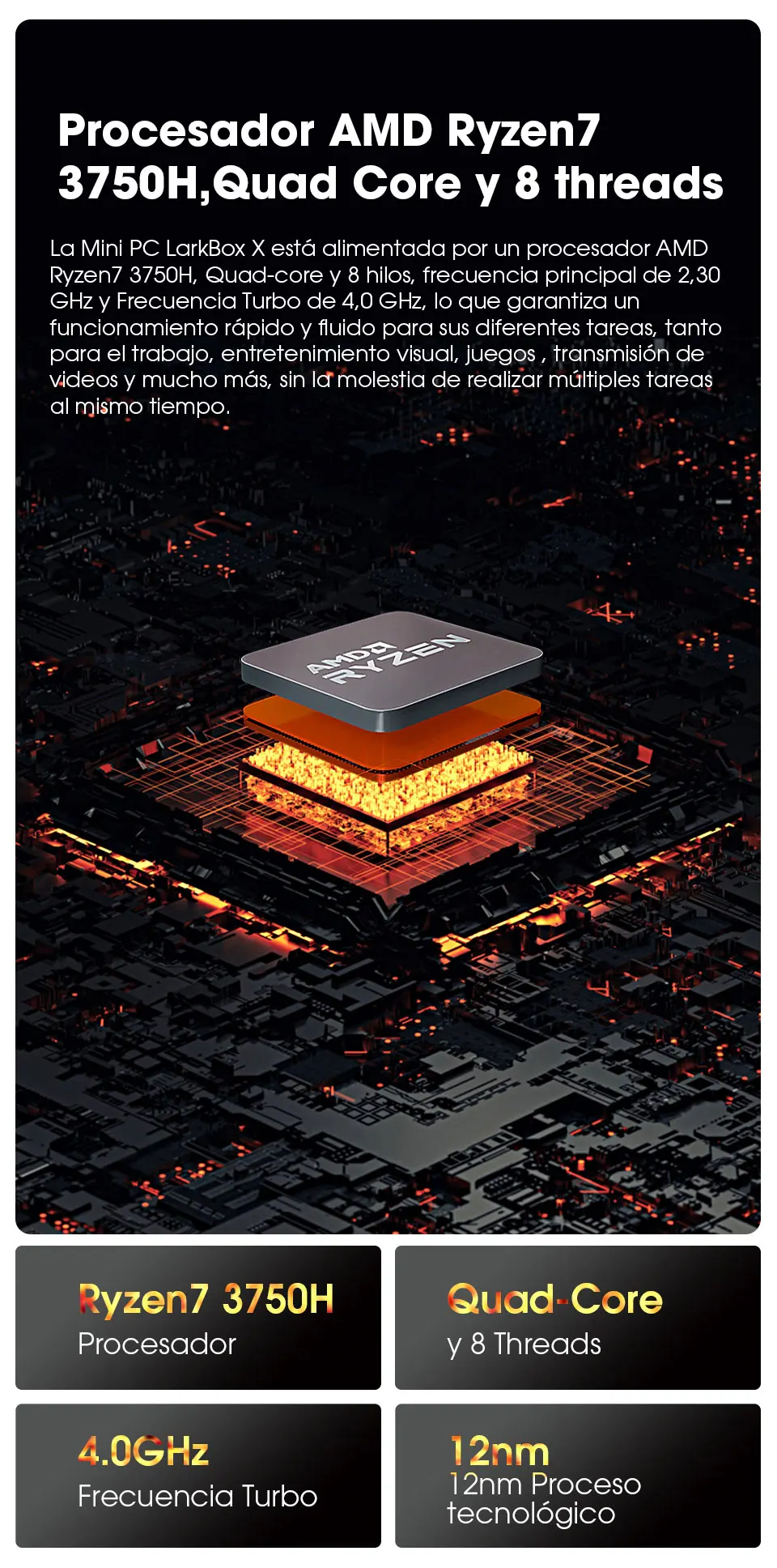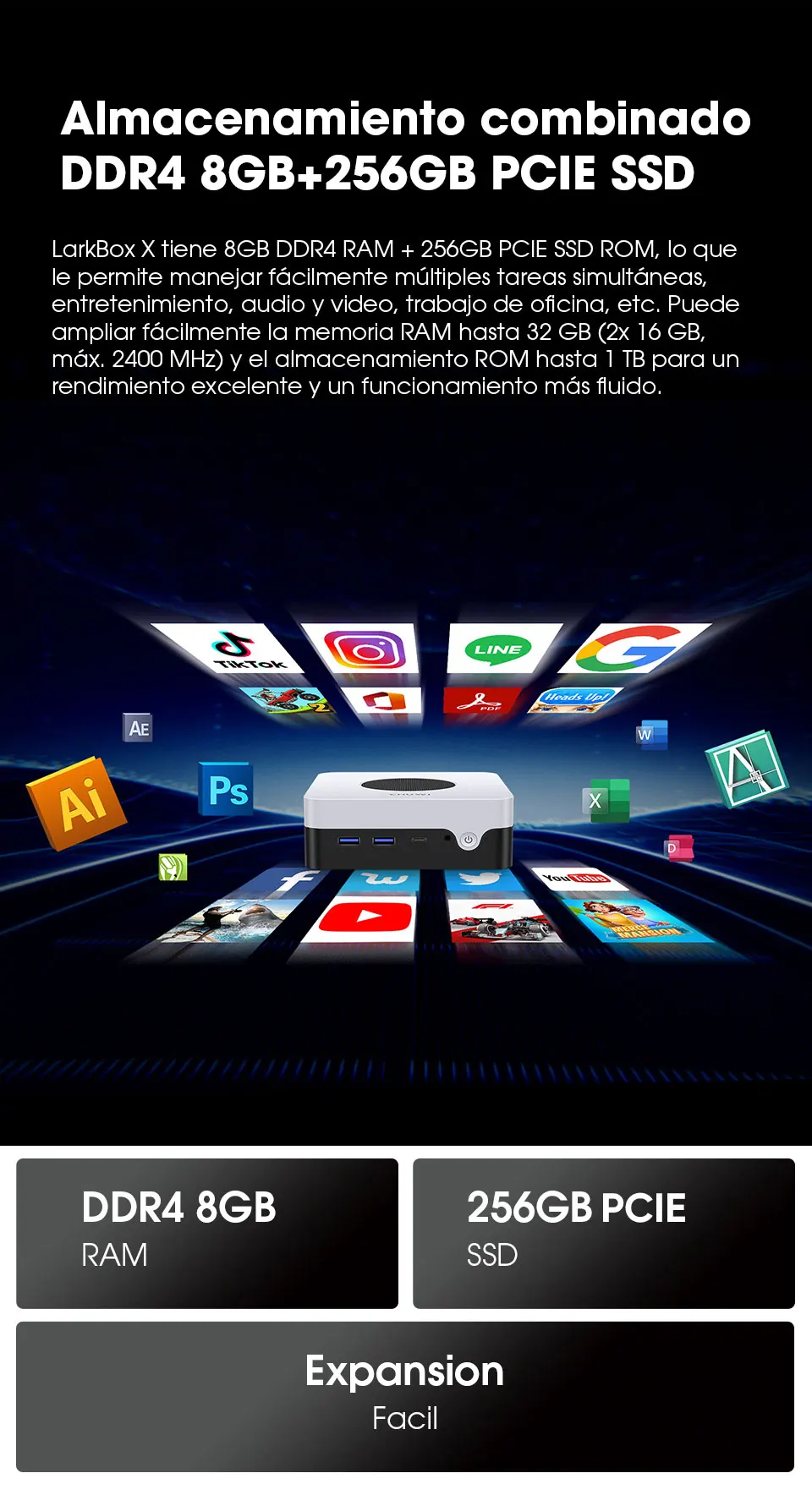 -Características de LarkBox Ryzen 7 Mini PC8GBDe RAM SDIMM de 2400MHz de doble canal que admite expansión de hasta 32GB, más256GB PCIE SSD, Puede reemplazar el almacenamiento SSD de 256GB a 1TB a través de una ranura de 2280 M.2.