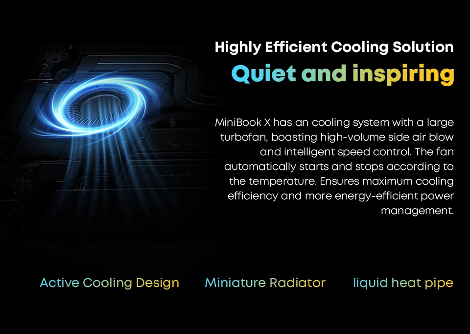 MiniBook X has an cooling system with a largeturbofan, boasting high-volume side air blowand intelligent speed control. The fanautomatically starts and stops according tothe temperature. Ensures maximum coolingefficiency and more energy-efficient powermanagement