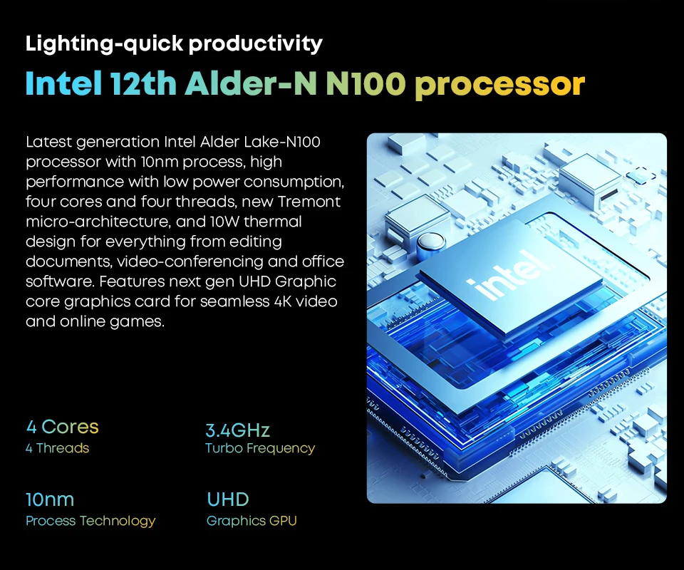 Latest generation Intel Alder Lake-N100processor with 10nm process, high