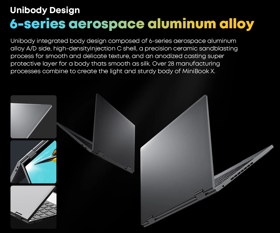 Unibody integrated body design composed of 6-series aerospace aluminumalloy A/D side, high-densityinjection C shell, a precision ceramic sandblastingprocess for smooth and delicate texture, and an anodized casting superprotective layer for a body thats smooth as silk. Over 28 manufacturingprocesses combine to create the light and sturdy body of MiniBook X