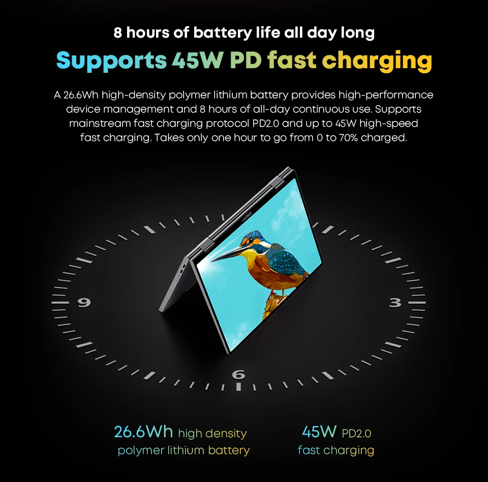 Una batería de polímero de litio de alta densidad de 26,6 Wh proporciona una gestión de dispositivos de alto rendimiento y 8 horas de uso continuo durante todo el día. Compatible con el Protocolo de carga rápida convencional PD2.0 y carga rápida de hasta 45W. Solo tarda una hora en pasar de 0 a 70% cargado.