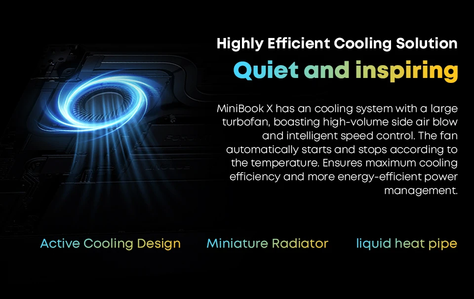 El MiniBook X tiene un sistema de refrigeración con un gran turboventilador, con un alto volumen de aire lateral y un control inteligente de la velocidad. El ventilador se inicia y se detiene automáticamente según la temperatura. Garantiza la máxima eficiencia de refrigeración y una gestión energética más eficiente