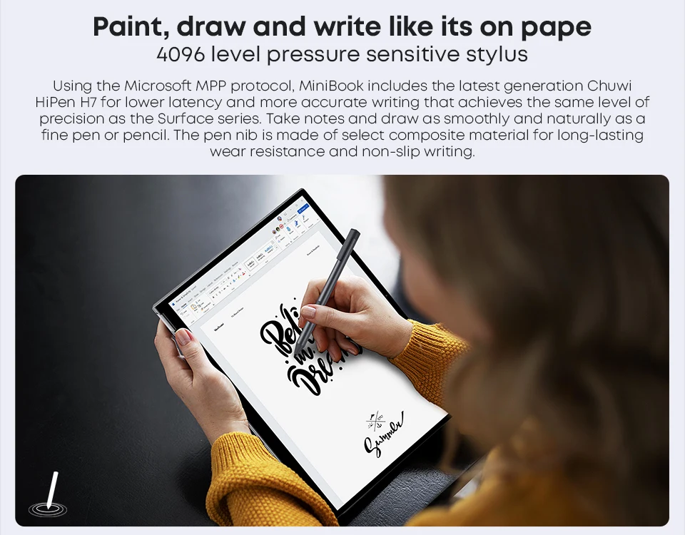 Utilizando el protocolo Microsoft MPP, MiniBook incluye la última generación ChuwiHiPen H7 para una menor latencia y una escritura más precisa que logra el mismo nivel de precisión que la serie Surface. Tome notas y Dibuje de forma tan suave y natural como un bolígrafo o lápiz. La punta del bolígrafo está hecha de material compuesto seleccionado para una resistencia al desgaste duradera y una escritura antideslizante.