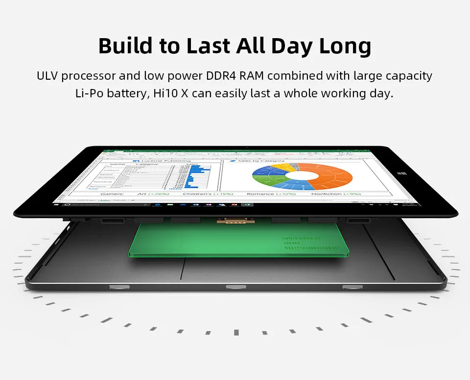 · Eficiente multitarea: La memoria RAM LPDDR4 de 6GB mejorada de CHUWI Hi10 X te ayuda a trabajar en diferentes programas sin disminuir la velocidad.