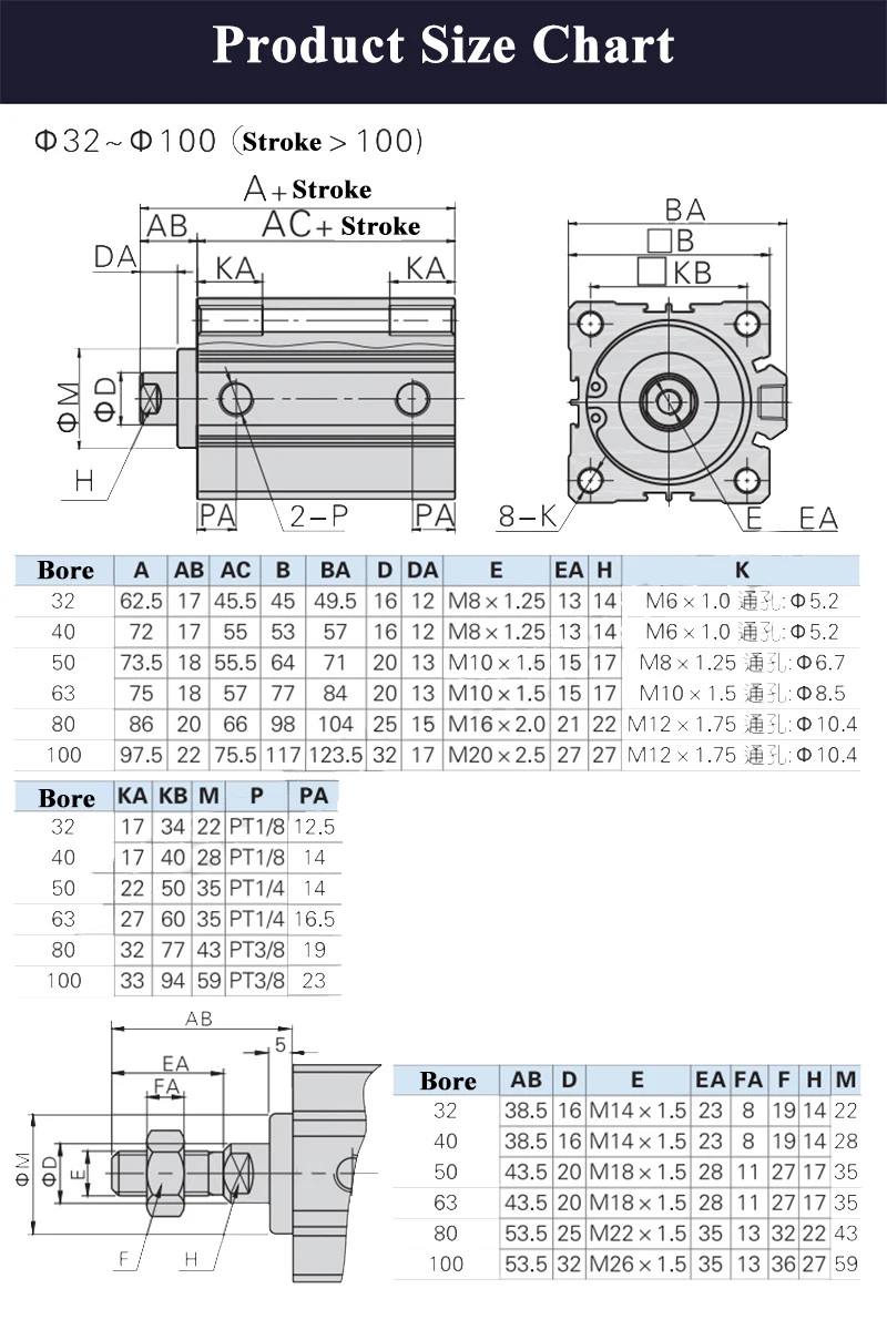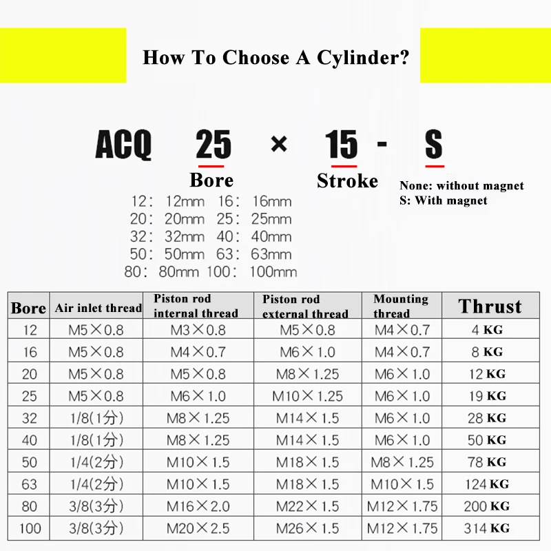 Comprar Cilindro neumático de aire de alta calidad, ACQ32/40/50/63x110/120/130/140-S-B, carrera extendida, cilindros compactos y delgados