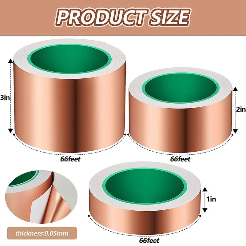 Uso multiusos: El paquete incluye 3 tamaños de cintas de cobre, 1 pulgada x 66 pies, 2 pulgadas x 66 pies y 3 pulgadas x 66 pies, 1 en cada tamaño, Que puede satisfacer sus necesidades de tamaño; ya sea que esté trabajando en un proyecto electrónico de bricolaje o buscando una solución confiable para proteger dispositivos electrónicos, la cinta de lámina de cobre es una buena opción