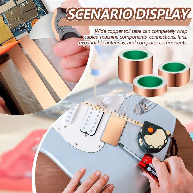 Aplicaciones versátiles: esta cinta de protección de cobre para guitarras se aplica principalmente para blindaje electromagnético, eliminando interferencias electromagnéticas (EMI), aislando las ondas electromagnéticas de dañar el cuerpo humano, Y es perfecto para una amplia gama de aplicaciones, incluyendo placas de circuito, reparaciones eléctricas y proyectos de arte.