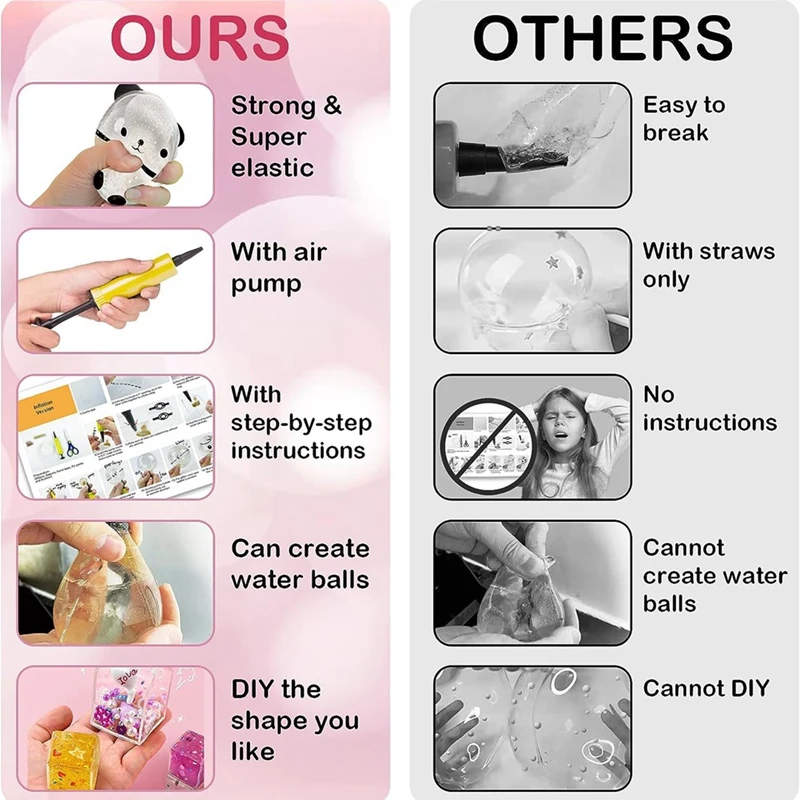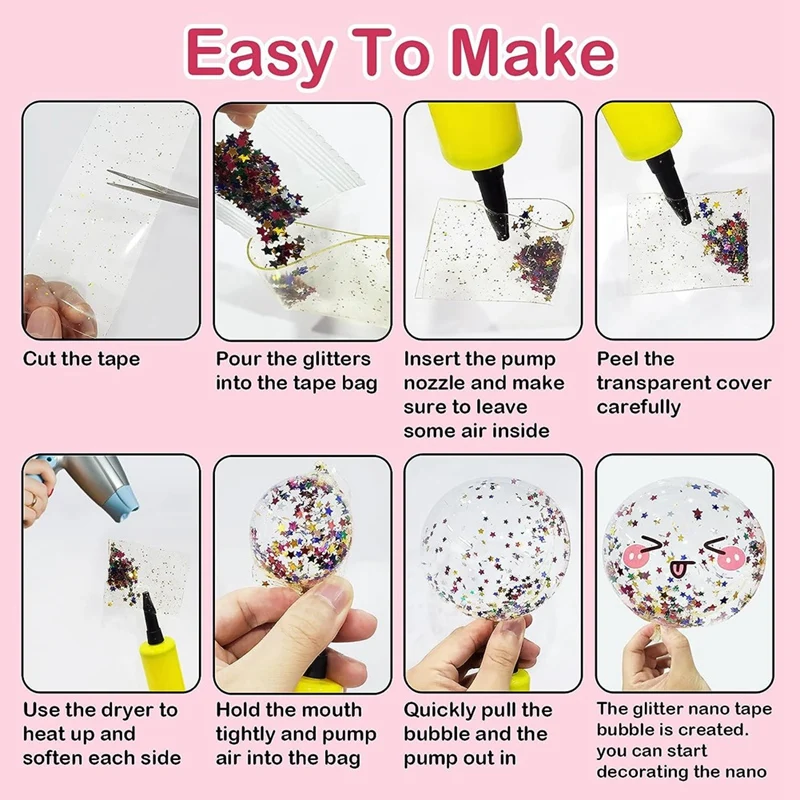 Forma de bricolaje que te gusta: con la bomba de aire y el manual de instrucciones incluidos, los niños pueden crear fácilmente sus propias burbujas de nanocinta únicas en la forma que les guste. Incluso pueden llenar las burbujas con agua para crear bolas de agua. ¡Las posibilidades son infinitas!