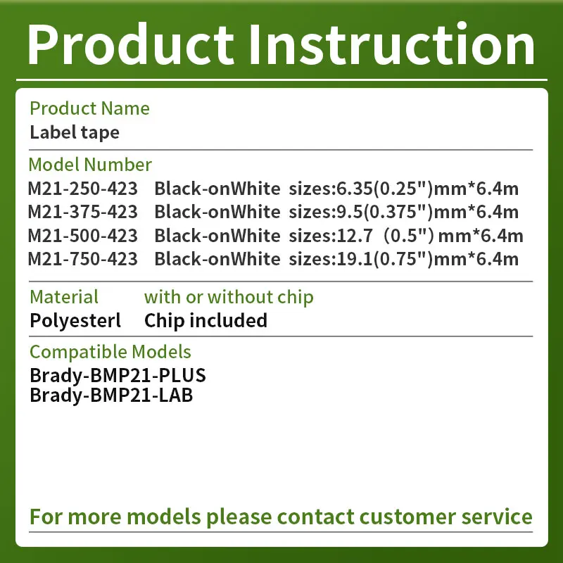 Cinta de etiquetas compatible M21-250-423 M21-375-423 M21-500-423 M21-750-423 para impresora de etiquetas portátil Brady-BMP21-PLUS BMP21-LAB Número de modelo: M21-250-423 Tamaños en blanco y negro: 6,35 (0,25") mm * 6,4 m M21-375-423 Tamaños en blanco y negro: 9,5 (0,375") mm * 6,4 m M21-500-423 Tamaños en blanco y negro: 12,7 (0,5") mm * 6,4 m M21-750-423 Negro-onBlanco Tamaños: 19,1 (0,75") mm * 6,4 m