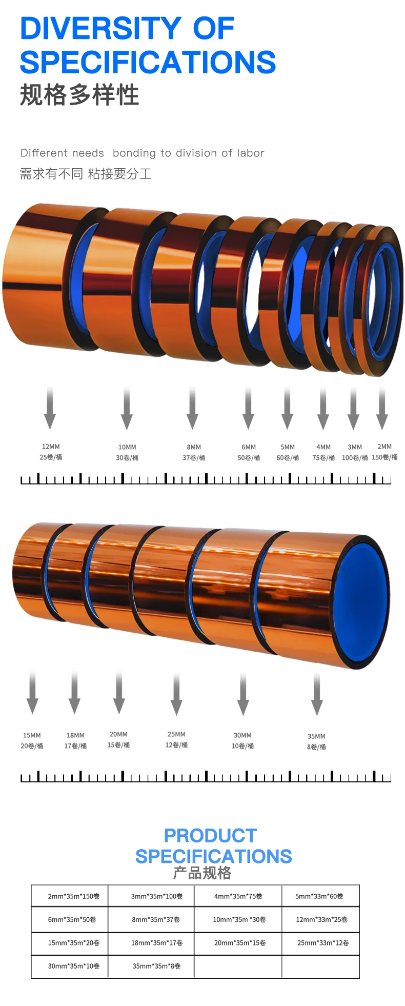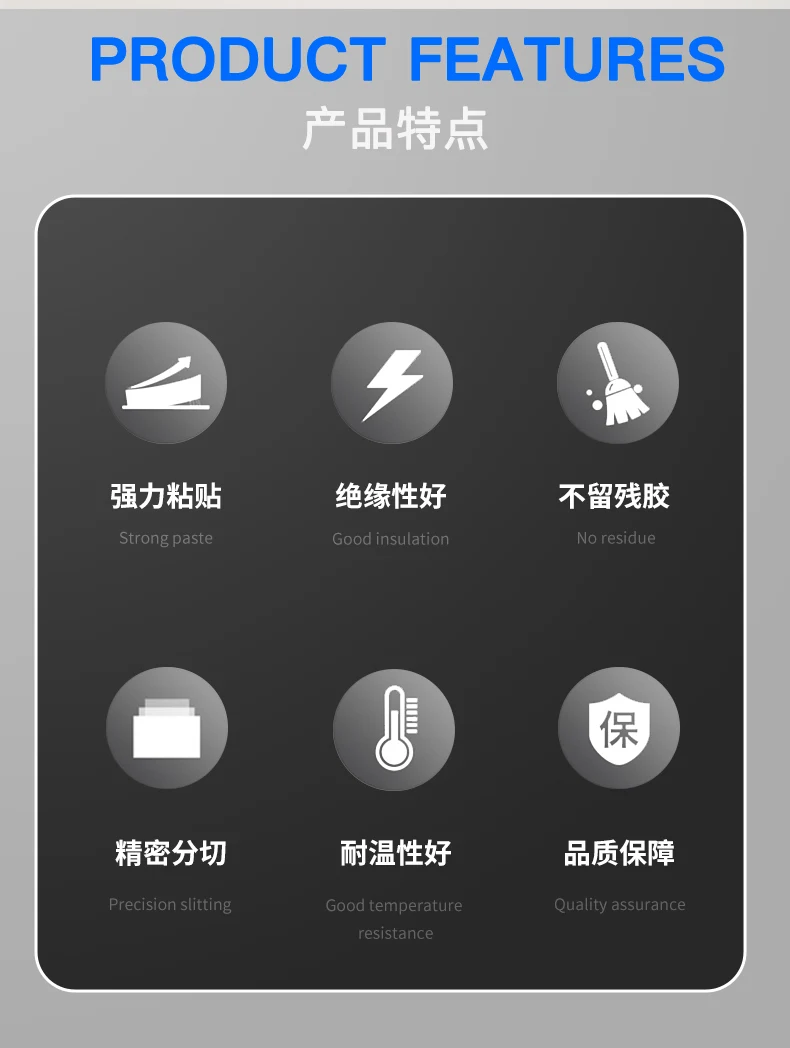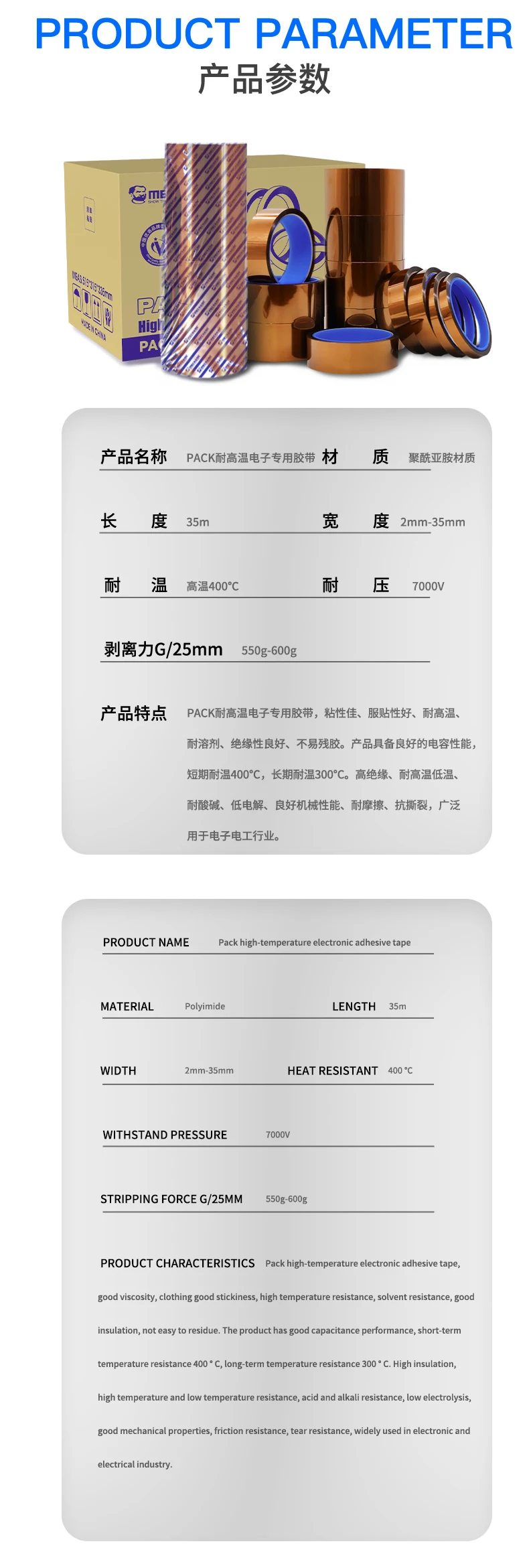 Características del producto: Tiene cinta de poliimida resistente a altas temperaturas, aislamiento eléctrico, resistencia a la radiación, resistencia a disolventes y otras propiedades.