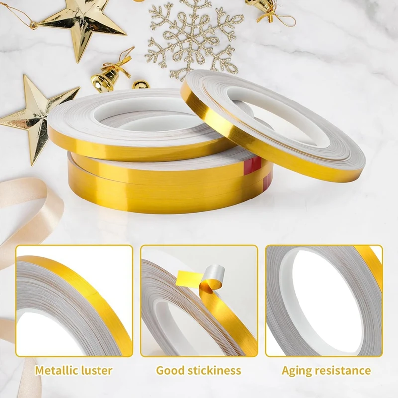 Generous Roll Size: the package comes with 5 rolls of metallic tape 0.4 inches in width With each roll measuring 55 yards in length, you'll have more than enough tape for large-scale projects. This not only saves you time but also reduces the need for frequent tape replacements, boosting efficiency and cost savings.