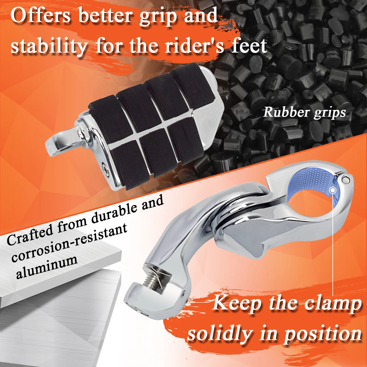 ^ Ángulos ajustables: las abrazaderas de montaje son ajustables en 360 grados y sujetan firmemente el protector del motor. Y, el diseño de bloqueo asegura que las estriberas permanezcan en el ángulo deseado. Superficie de goma duradera grabada antideslizante.