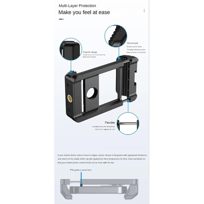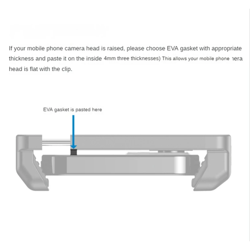3. Si la cabeza de la cámara de su teléfono móvil está levantada, elija un espaciador Eva del grosor apropiado y péguelo en la superficie interior del clip (el espaciador tiene tres grosores de 2mm, 3mm y 4mm, necesita comprar juntas usted mismo) Para que la cabeza de la cámara de su teléfono móvil pueda estar al ras con el clip.
