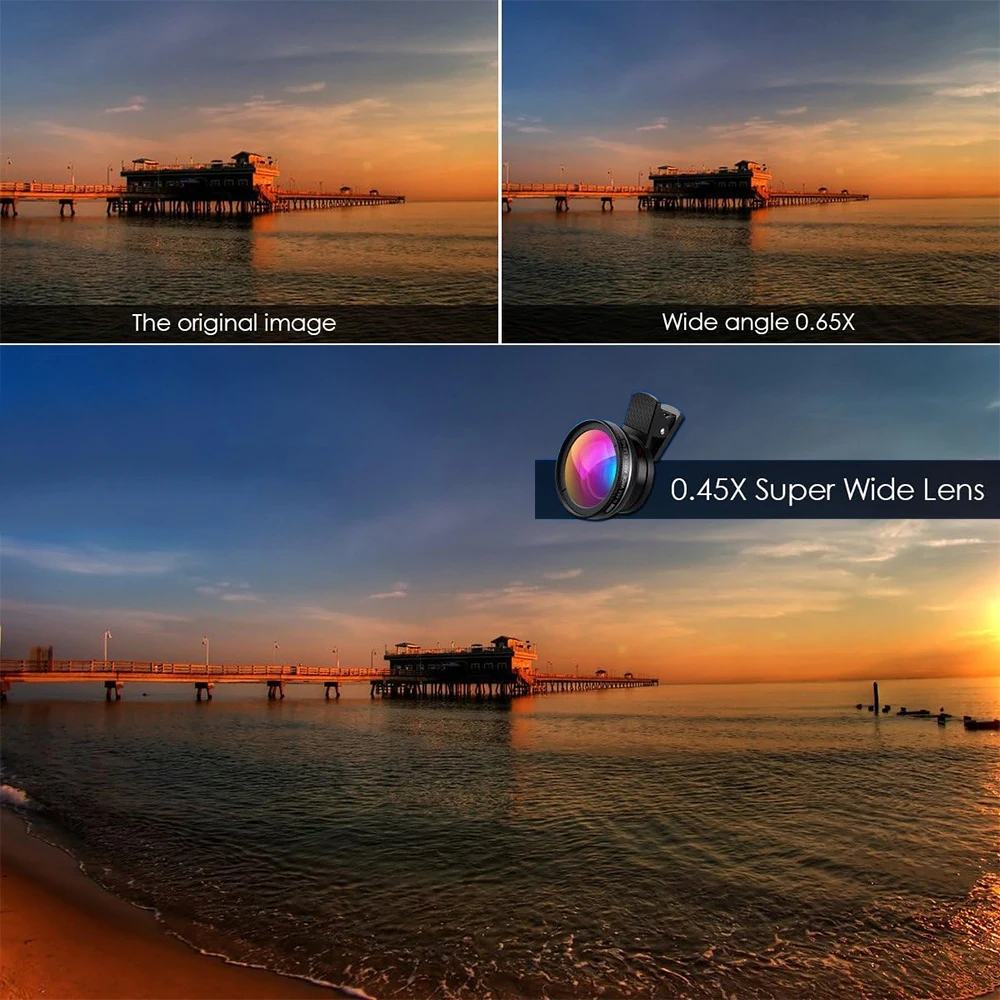 3.) Lente súper gran angular de 37 mm, 0,45 x 49uv: se adapta a un campo de visión más amplio, la lente gran angular súper amplia de 0,45 x es ideal para tomas grupales y arquitectura; paisaje.Puede capturar un 45% más de vista.Y sin distorsión.