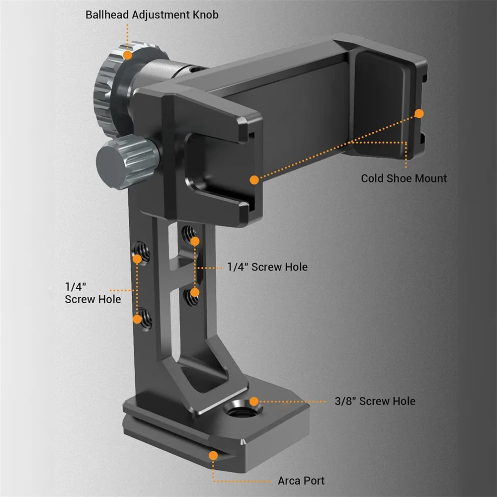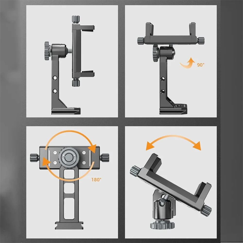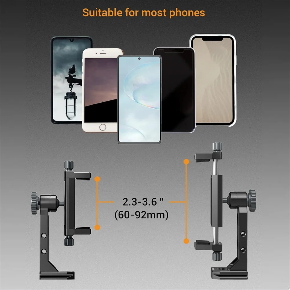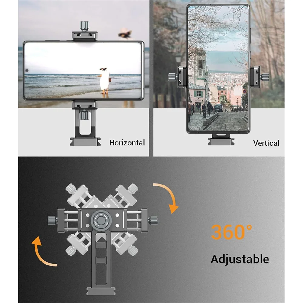 Mejore la fotografía de su teléfono con nuestro versátil 360° ¡Soporte de trípode de metal para teléfono!Con 2 zapatas frías y un puerto Arca, admite la rotación vertical y horizontal para obtener el ángulo perfecto.Con compatibilidad con varios modelos de teléfonos, continúe con cualquier aventura fotográfica con facilidad y precisión.