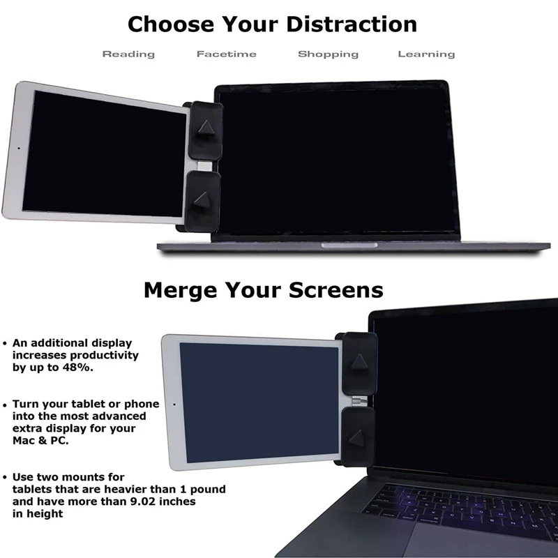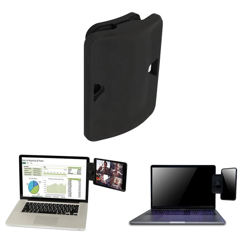 PANTALLA DE MONITOR MÚLTIPLE: Este clip de montaje lateral puede sujetar la tableta o el teléfono celular a la computadora portátil para obtener una experiencia informática de múltiples pantallas, extender su pantalla, aumentar su productividad y realizar múltiples tareas en casa, oficina o en movimiento