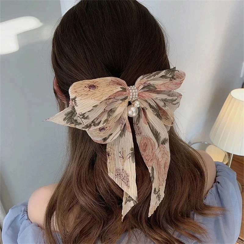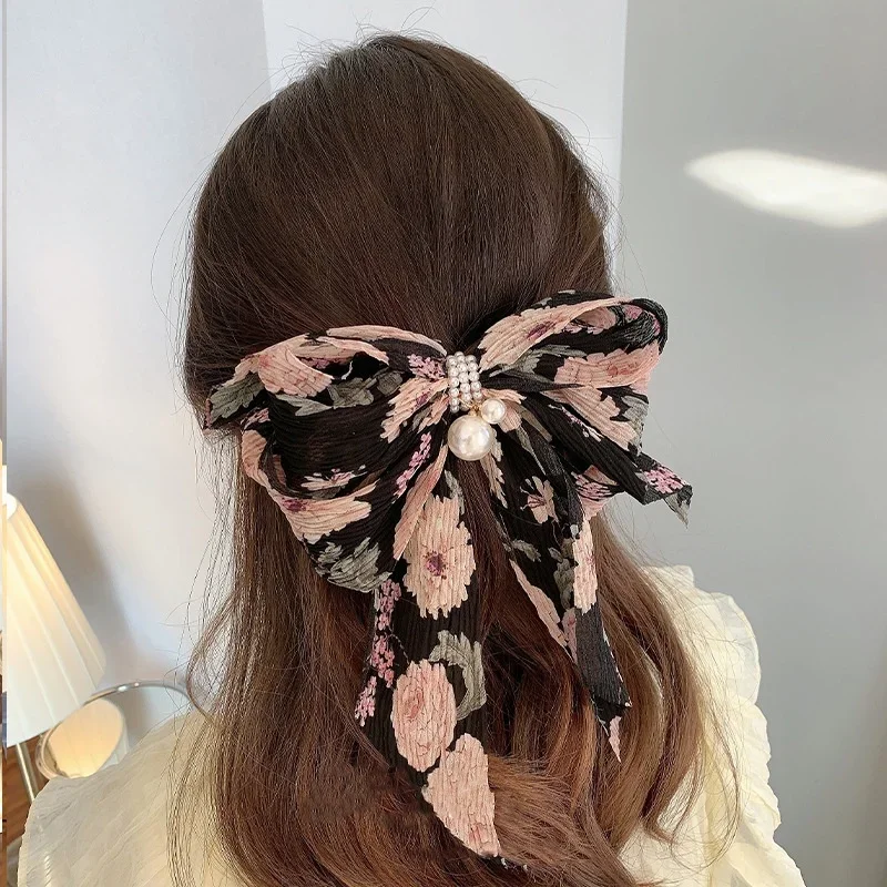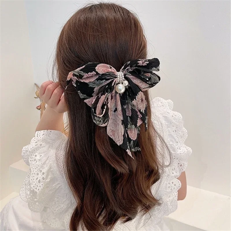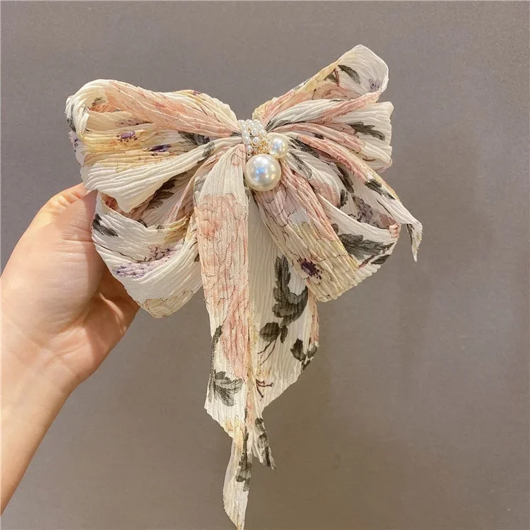 Comprar Clip de pelo Floral de tela dulce con lazo grande, versión coreana de la parte posterior de la cabeza, accesorios para el cabello con Clip de pico de pato para mujer