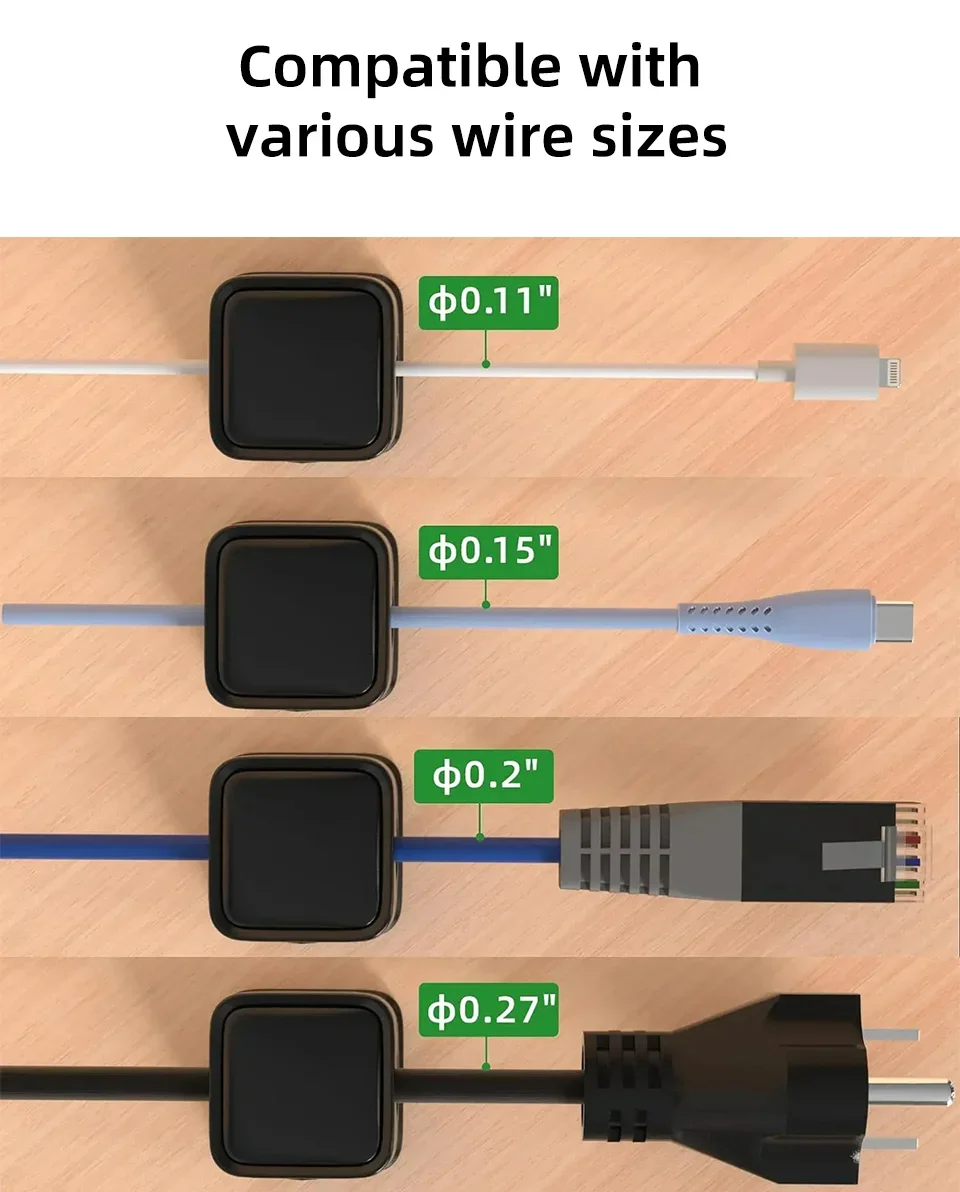 4. 【Hace que sus cables estén organizados】El organizador de cables puede sujetar los cables en su lugar firmemente y mantenerlos alejados del piso.Más importante aún, el juego de 6 paquetes le permite mantener los cables hacia los rastros limpios como desee, como colocarlos en el escritorio de la oficina, la mesa, el rincón de la mesa, la pared o el tablero del automóvil.