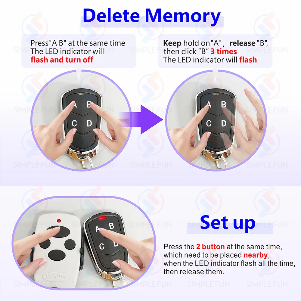 2.Mantenga presionado un botón en su control remoto original y luego presione y mantenga presionado un botón en su control remoto clonado.Continúe presionando hasta que el LED parpadee 2 (Nota: el LED 2 parpadea para no soltar el botón) Luego, 3 parpadea y luego permanece fijo y se ha clonado con éxito.(cada botón sigue la misma operación anterior)