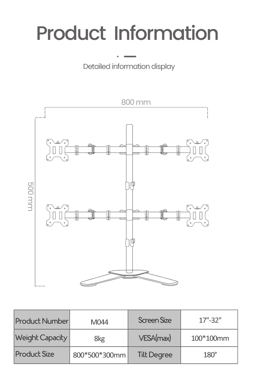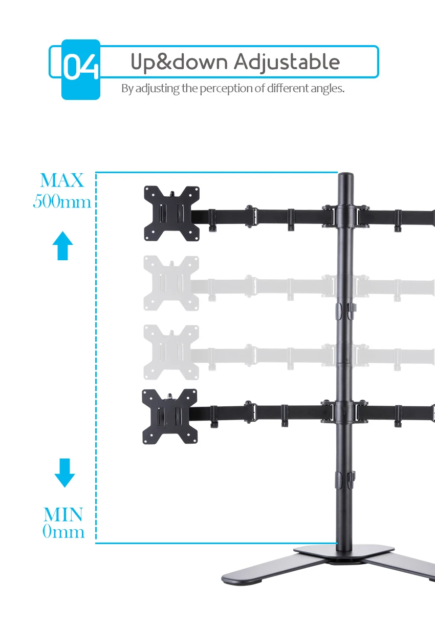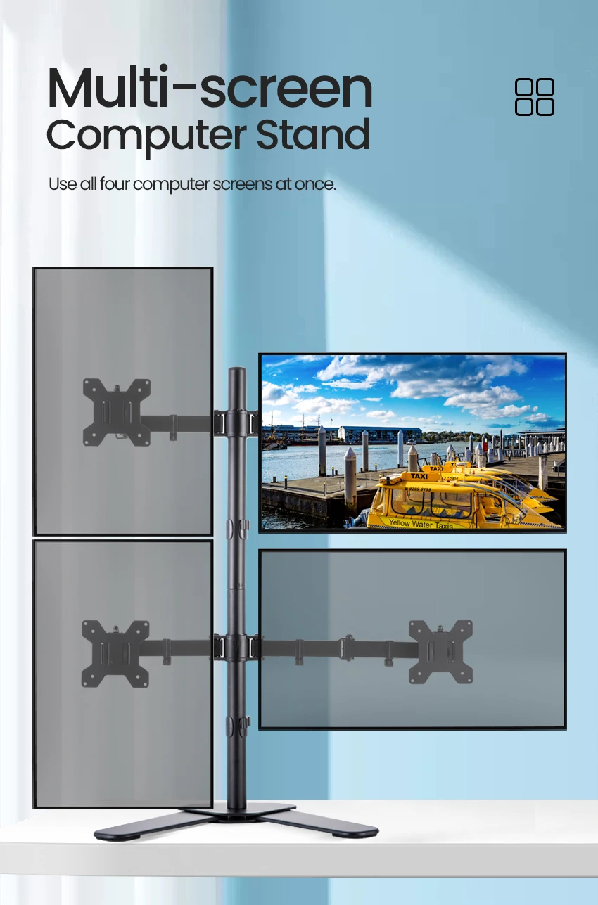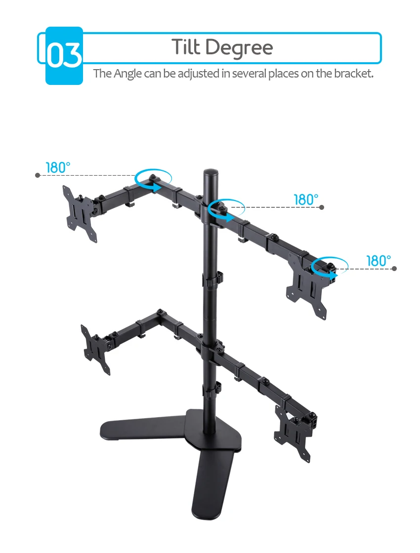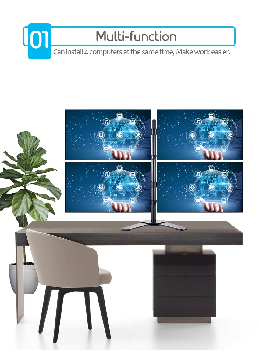 1. Soporte de escritorio de brazo cuádruple de acero resistente: monta cuatro pantallas una al lado de la otra para liberar espacio en el escritorio cómodamente. Capacidad para cuatro televisores o monitores de 17 "-32" con una capacidad de carga máxima de 8 kg para cada brazo