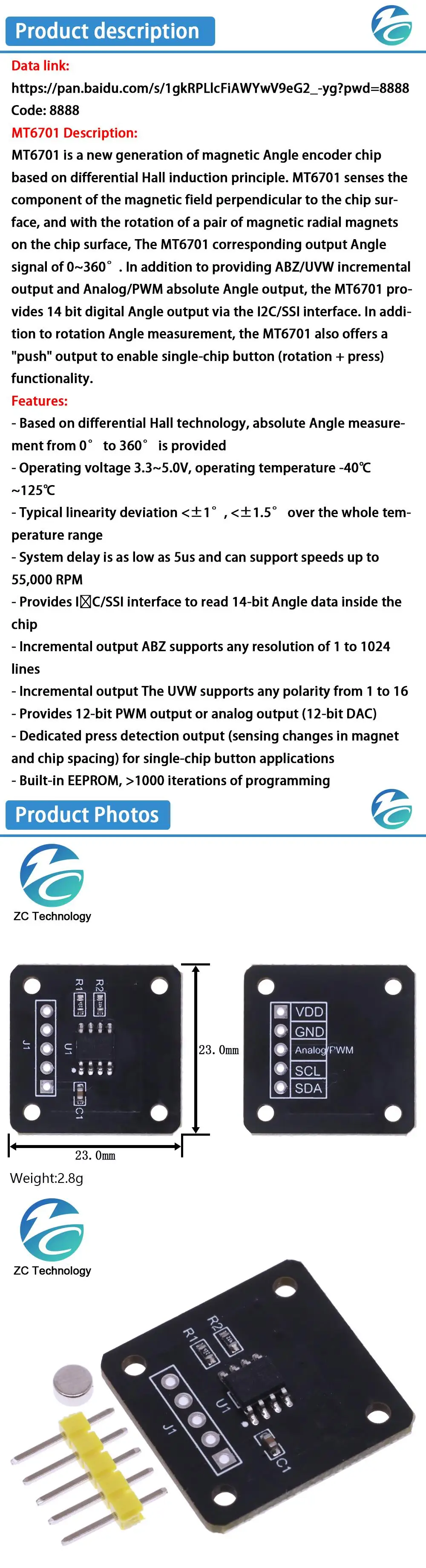 MT6701 es una nueva generación de chip codificador de ángulo magnético basado en el principio de inducción diferencial Hall.MT6701 detecta el componente del campo magnético perpendicular a la superficie del chip, y con la rotación de un par de imanes radiales magnéticos en la superficie del chip, la señal de ángulo de salida correspondiente MT6701 de 0 ~ 360°.Además de proporcionar salida incremental ABZ/UVW y salida de ángulo absoluto analógico/PWM, el MT6701 proporciona salida de ángulo digital de 14 bits a través de la interfaz I2C/SSI.Además de la medición del ángulo de rotación, el MT6701 también ofrece una salida de "empuje" para habilitar la funcionalidad del botón de un solo chip (rotación + pulsación).
