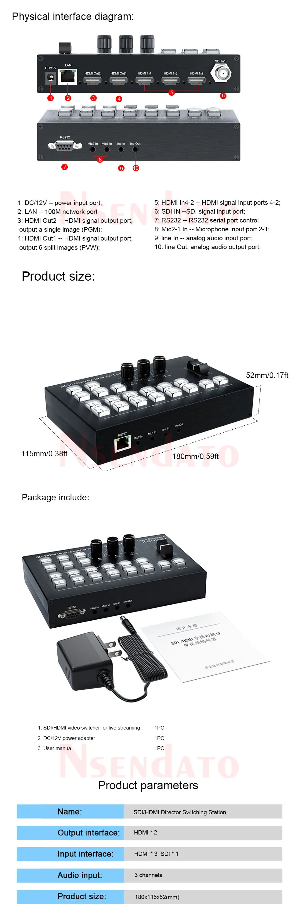 Introducción:Este equipo es un conmutador de video multicanal profesional, un conmutador de video profesional todo en uno que ofrece codificación y transmisión en vivo en tiempo real.1 entrada SDI y 3 entradas HDMI admiten resolución 1080P@60Hz y admite HDCP1.4 estándar, admite audio integrado HD o audio analógico externo, después de un procesamiento mixto, se puede integrar en la señal HD de salida o salir desde el puerto analógico.Adecuado para transmisión en vivo, grabación de conferencias y eventos en el sitio, satisfaciendo las necesidades de conmutación de video de transmisión, producción de programas, creación de material de cursos escolares y más.Característica:Conmutación de 4 cámaras, admite salidas duales PGM/PVW, transiciones perfectas, efectos de desvanecimiento/desvanecimiento y más.1 entrada de señal SDI admite una resolución de 1920*1080/60hz y admite transmisión sin pérdidas de 100 m;Convierte fácilmente señales SDI de nivel de transmisión;3 entradas HDMI; 2 salidas HDMI;1 puerto RJ45 Gigabit Ethernet compatible con protocolos RTMP/RTSP;Codificador de hardware incorporado, admite codificación H.264/H.265;Admite señal del canal de entrada de pantalla OSD, información de resolución, información de volumen;Visualización de la dirección IP del codificador de video (predeterminado: 19,168,1,55);Admite salida de mezcla MIC,LINE IN,HD (salida de mezcla fija ONLINE OUT);Admite seguimiento de audio HD (pgm seguimiento fijo);Admite salida de audio LINE OUT y HD;Admite configuración de ahorro de apagado;Teclas de alta calidad, diseño de retroiluminación de color.Especificaciones:Resolución de entrada SDI: hasta 1080P@60HzVelocidad de transmisión SDI: hasta 2,97 GbpsLongitud del cable de entrada SDI: máx. 100 metros, utilizando cable de vídeo digital RG6 75R HDResolución de entrada HDMI: 1080P@60HzResolución de salida HDMI: 1080P@60HzProtocolos de transmisión del codificador de vídeo Ethernet (RJ45) para transmisión push/pull:RTMP/RTSPVelocidad de bits del codificador de vídeo: máx.8MbpsCodificador de vídeo Resolución de transmisión Push/Pull:1920*1080@50HzPuerto LAN: 10/100MAdmite formato de codificación del codificador de video: H.264/H.265Codificación de audio del codificador de vídeo: AAC, 48 KHzAdmite la dirección IP de la pantalla OSD: Predeterminado: 192.168.1.55Admite formato de audio: PCMLa transmisión de ancho de banda máxima: 148,5 MHzVelocidad máxima de transmisión: 1,65 x3 GbpsLongitud del cable de entrada: 1080P/60Hz≤15 m Cable estándar HDMI AWG26Longitud del cable de salida: 1080P/60Hz≤15 m Cable estándar HDMI AWG26Corriente máxima de trabajo: 0,85 A.Especificaciones del adaptador de corriente: Entrada CA (50 Hz, 60 Hz) 100 V-240 V; Salida: CC/12 V 2 APaquete:Conmutador de vídeo SDI/HDMI para transmisión en vivoAdaptador de corriente CC/12 Vmanual