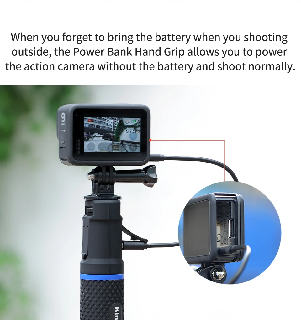 When you forget to bring the battery when you shooting outside, the Power Bank Hand Grip allows you to power the action camera without the battery and shoot normally