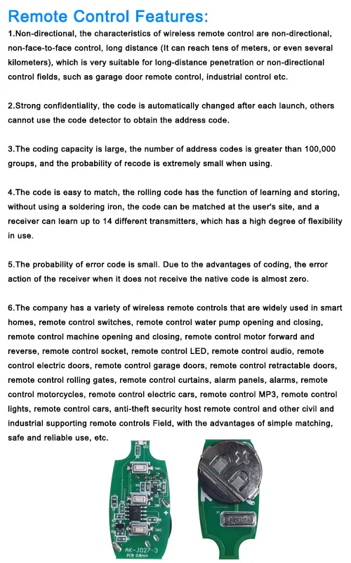 4.Proporciona una réplica de control remoto duradero y confiable para las llaves eléctricas de sus puertas de garaje.Diseño elegante y rendimiento de alta calidad.Úselo con el control remoto inalámbrico de copia universal de 433 MHZ.
