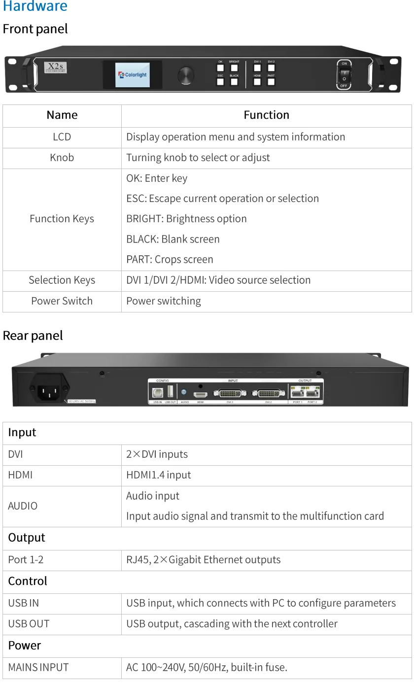 X2s adopta 2 salidas Gigabit Ethernet y admite pantallas LED de 4096 píxeles de ancho máximo o 2560 píxeles de altura máxima. Mientras tanto, X2s está equipado con una serie de funciones versátiles que pueden proporcionar un control de pantalla flexible y pantallas de imágenes de alta calidad. Se puede aplicar perfectamente a pantallas LED pequeñas.