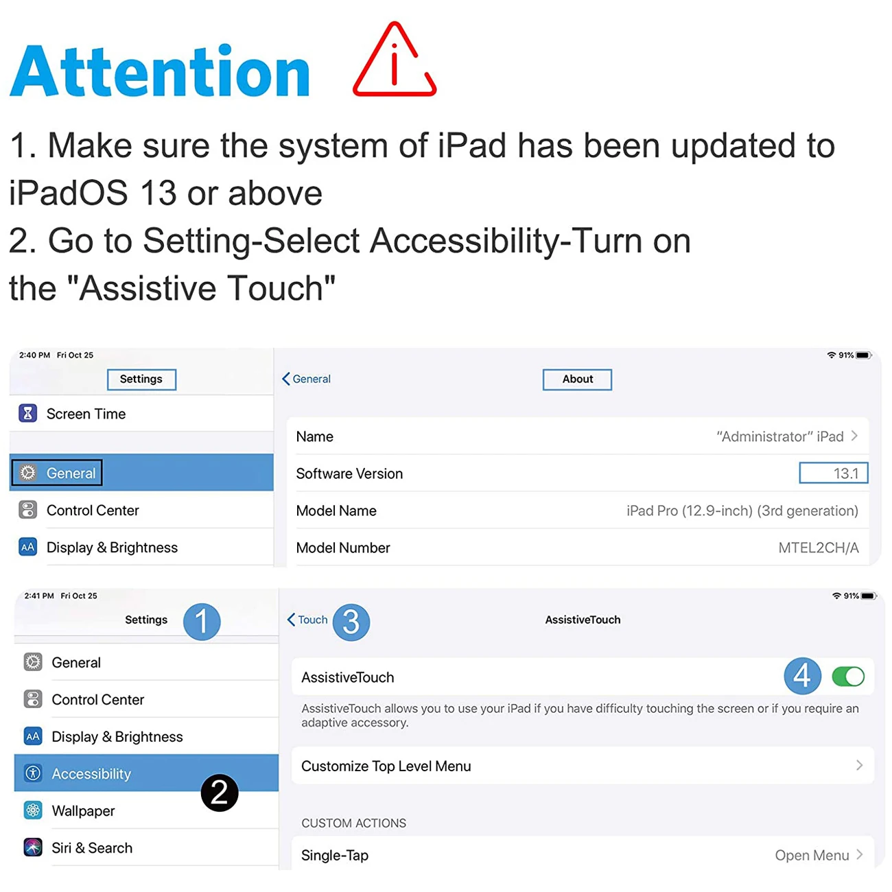 Este mouse Bluetooth solo es compatible con el sistema iPadOS 13 anterior.Si su sistema no lo es, primero actualice el sistema.Es importante destacar que es necesario abrir la función “AssistiveTouch” siguiendo los siguientes pasos para configurarlo: Configuración - Accessibilidad - AssistiveTouch