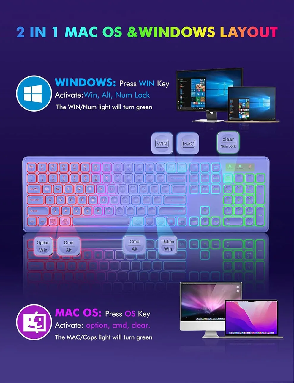 👍UN TECLADO, DISPLAY DE DOS ESTEMOS: cambiar entre los diseños Mac y Windows del teclado iluminado de sistema dual es tan fácil como un solo toque.El adaptador USB A a tipo C está listo para adaptarse a su sistema.