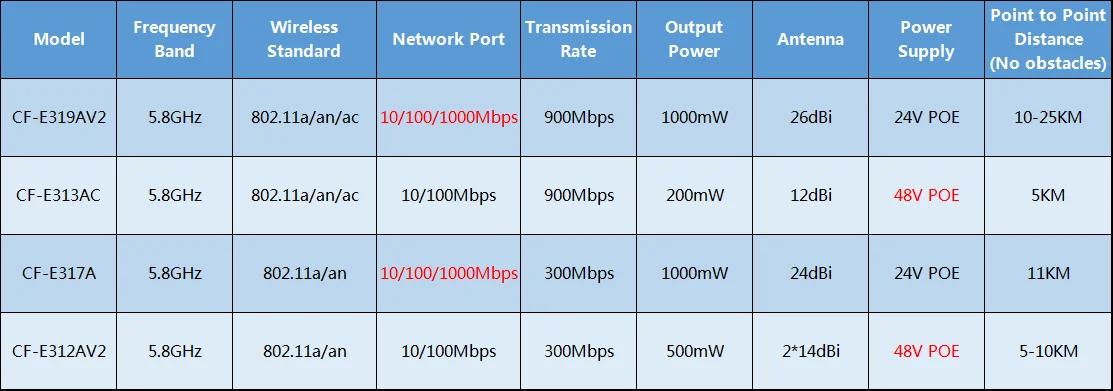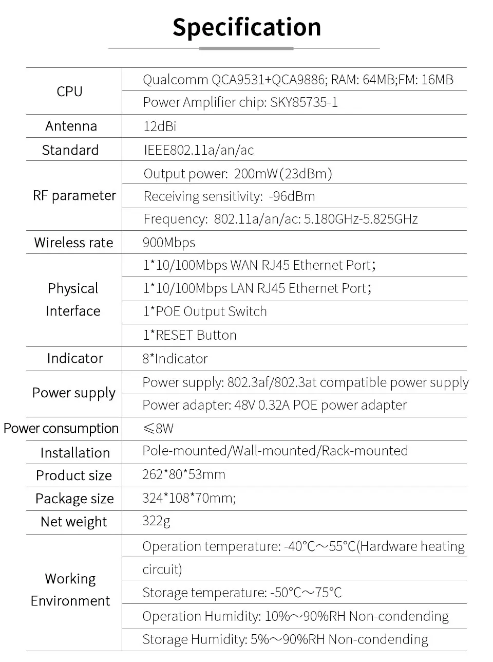 10 ventajas Transmisión de larga distancia de 11 km Antena de 26 dBi Potencia de transmisión de 60 dBm Nivel de protección IP65 Fuente de alimentación flexible PoE Antiinterferencias de 5,8 GHz Ocultar SSID Chip Qualcomm PA de alta potencia