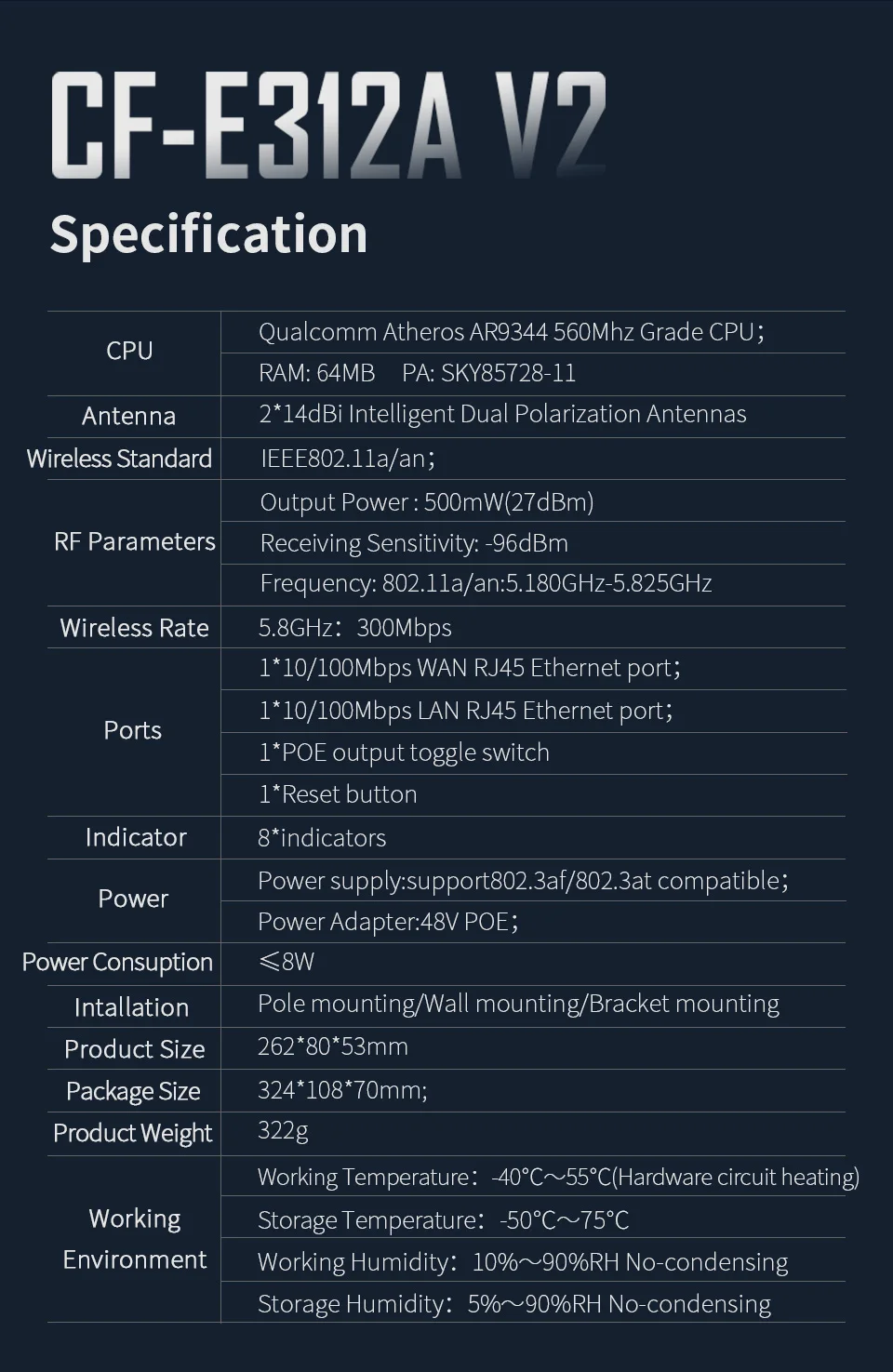 Especificaciones del CF-E319A:Antena:26 dBiAntena direccional con forma de mariposa de alta ganancia