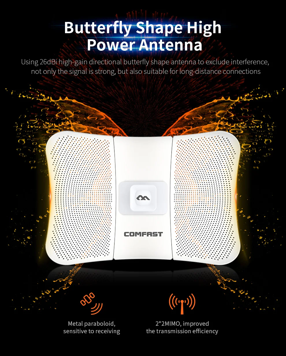 Antena de alta potencia con forma de mariposaEl uso de una antena direccional con forma de mariposa de alta ganancia de 26 dBi excluye las interferencias, no solo la señal es fuerte, sino que también es adecuada para conexiones de larga distancia.