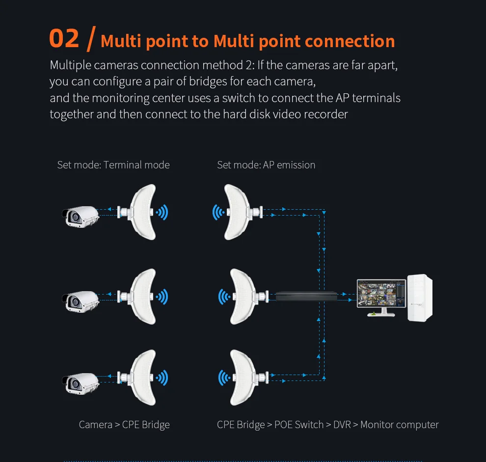 Escena 2: Conexión multipunto a multipunto Si las cámaras están muy separadas, puede configurar un par de puentes para cada cámara, y el centro de monitoreo usa un interruptor para conectar los terminales AP y luego conectarse a la grabadora de video del disco duro.