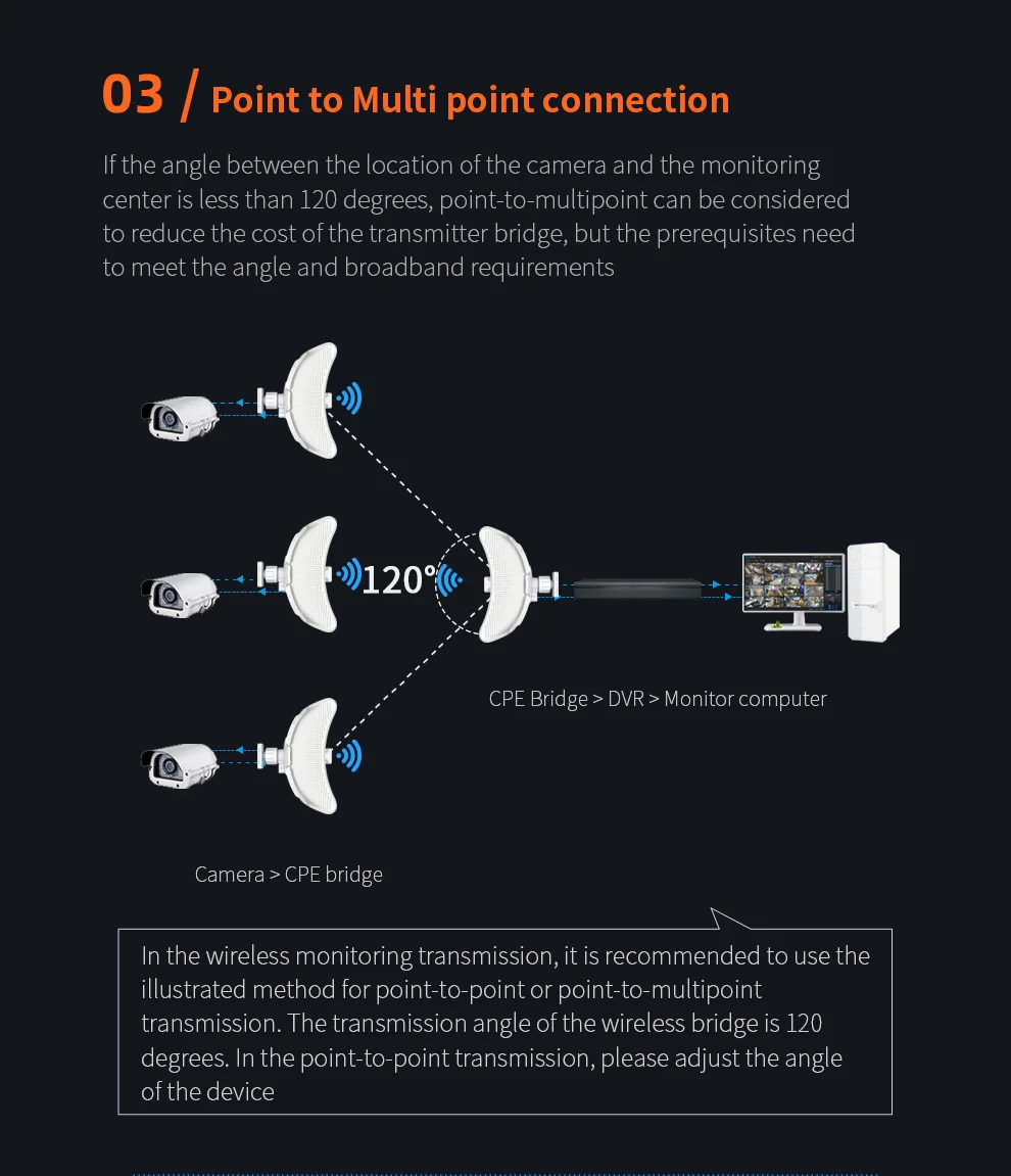 Escena 3: Conexión punto a multipunto Si el ángulo entre la ubicación de la cámara y el centro de monitoreo es inferior a 120 grados, se puede considerar punto a multipunto para reducir el costo del puente del transmisor, pero los requisitos previos deben cumplir con los requisitos de ángulo y banda ancha.