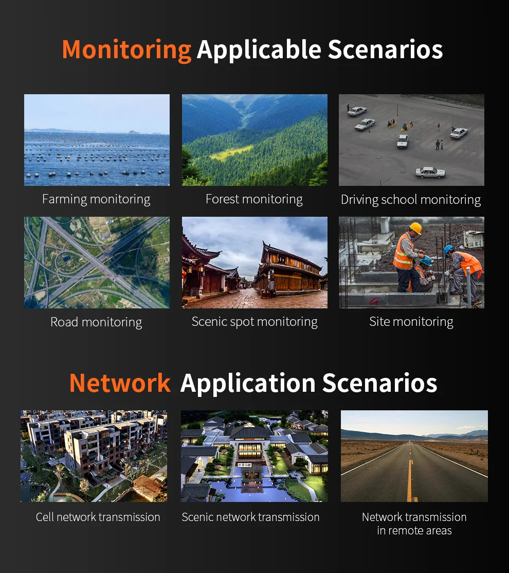 Monitoreo de escenarios aplicables Monitoreo de agricultura/Monitoreo forestal/Monitoreo de escuelas de conducción/Monitoreo de carreteras/Monitoreo de puntos escénicos/Monitoreo de sitiosEscenarios de aplicaciones de redTransmisión de red celular/Transmisión de red escénica/Transmisión de red en áreas remotas