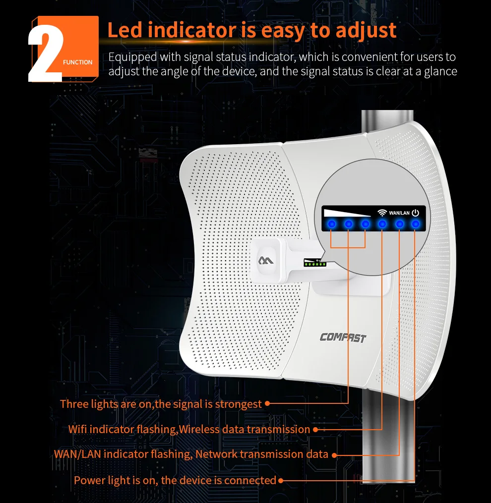 Función 2: el indicador LED es fácil de ajustar Equipado con un indicador de estado de la señal, que es conveniente para que los usuarios ajusten el ángulo del dispositivo y el estado de la señal es claro de un vistazoTres luces están encendidas, la señal es más fuerte--Indicador WiFi parpadeante, transmisión de datos inalámbrica--Indicador WAN/LAN parpadeante, datos de transmisión de red--La luz de encendido está encendida, el dispositivo está conectado