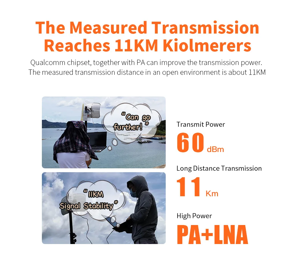 La transmisión medida alcanza kilómetros de 11 km.El chipset Qualcomm, junto con PA, puede mejorar la potencia de transmisión. La distancia de transmisión medida en un entorno abierto es de aproximadamente 1 KM (60 dBm de potencia de transmisión; 11 KMTransmisión larga; PA+LNAHlta potencia)