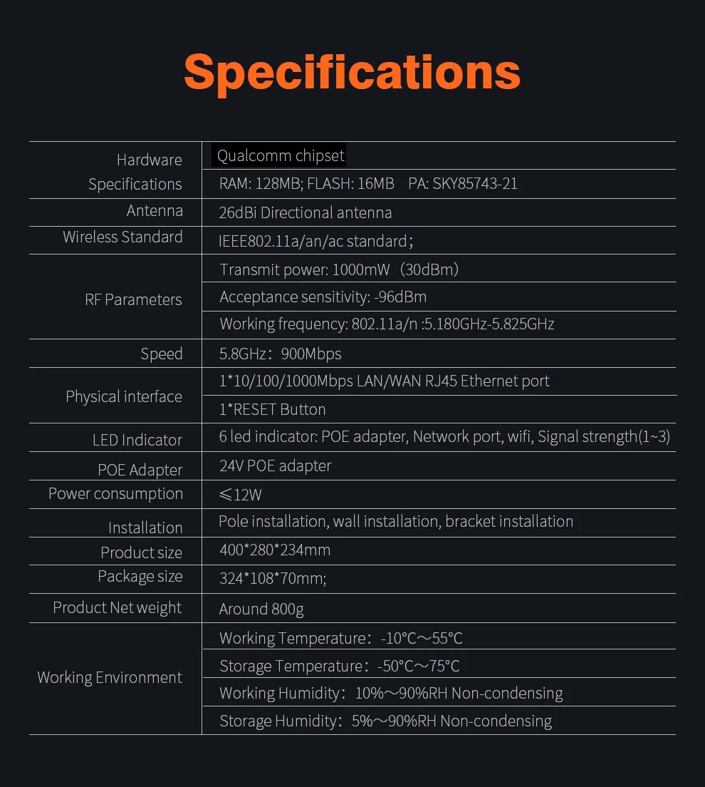 10 ventajas Transmisión de larga distancia de 11 km Antena de 26 dBi Potencia de transmisión de 60 dBm Nivel de protección IP65 Fuente de alimentación flexible PoE Antiinterferencias de 5,8 GHz Ocultar SSID Chip Qualcomm PA de alta potencia