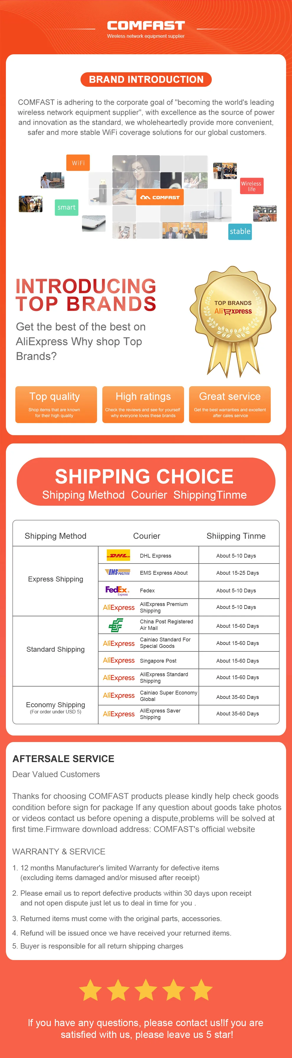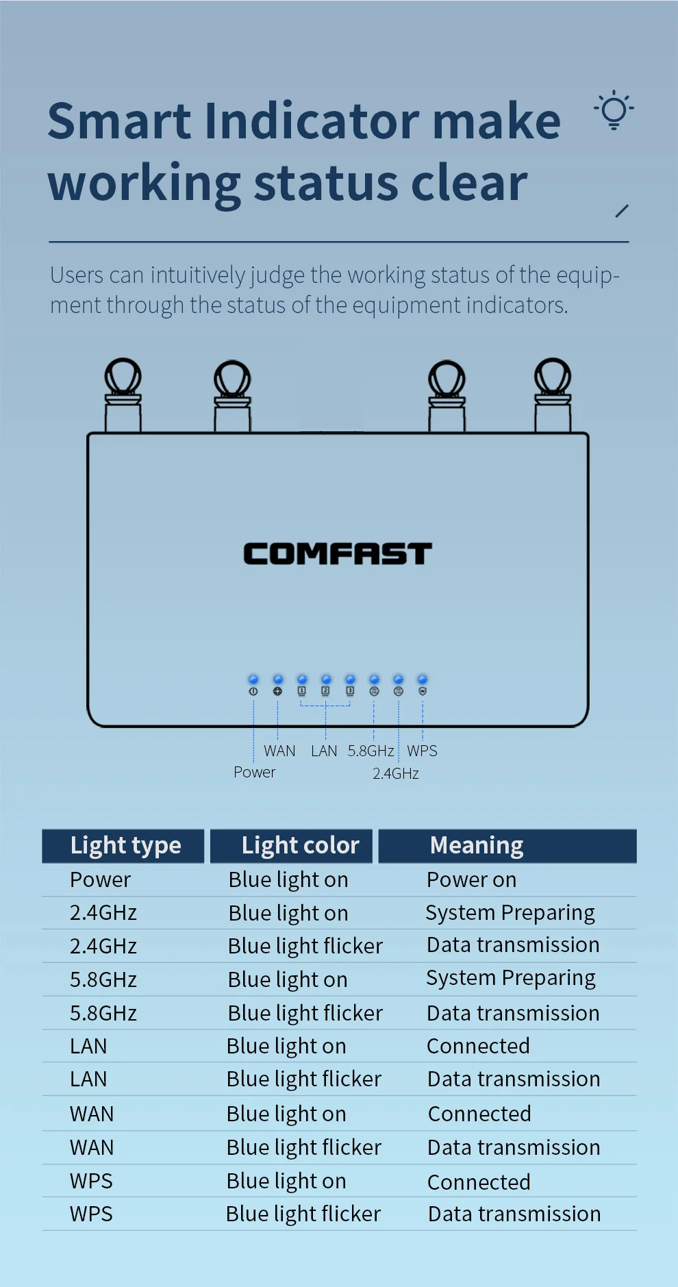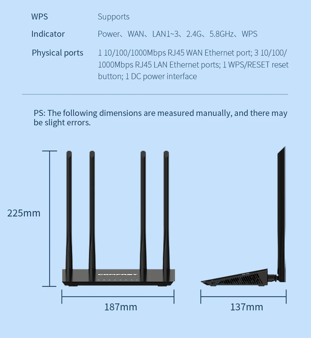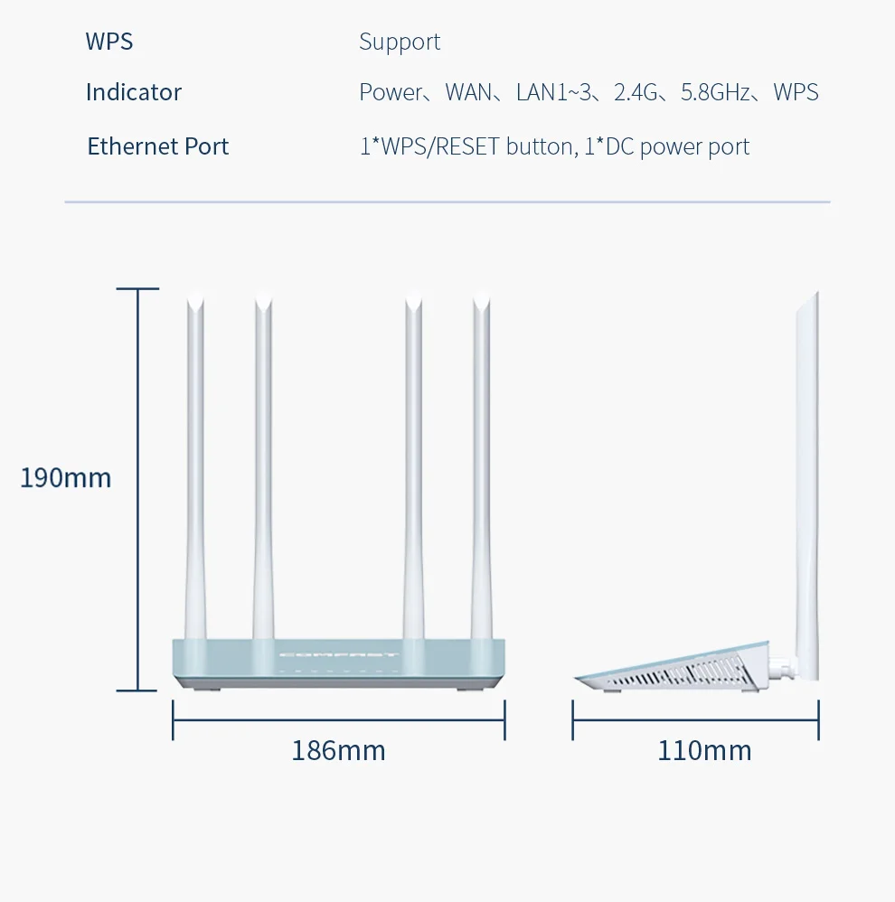 El producto es muy decepcionante. La velocidad máxima de la red wifi es de 100Mbps tanto en 2,4Mhz como en 5Mhz, en lugar de 1GB en 5MHz. COMFAST no responde a mi solicitud de soporte.