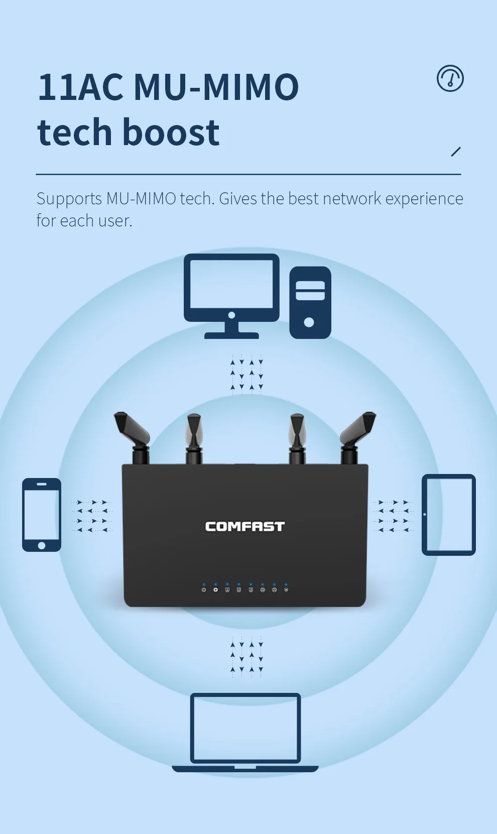 Utiliza tecnología 11AC en la banda de frecuencia de 5GHz y la velocidad de Internet puede alcanzar 1200Mbps(2,4 GHz 300 Mbps + 5,8 GHz 867 Mbps).