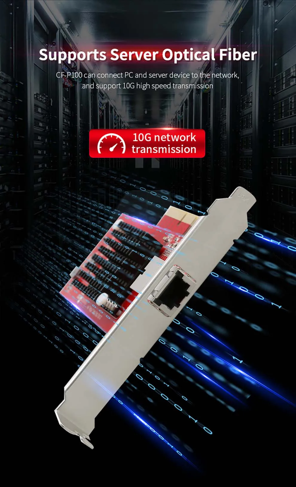 CF-P100 is a 10G single electrical port SFP desktop PCI-E network card with a high speed of up to 10Gbps. It is suitable for gaming desktops or server fiber optic network card access. It is suitable for home users or enterprise users who have high requirements for network stability and speed.