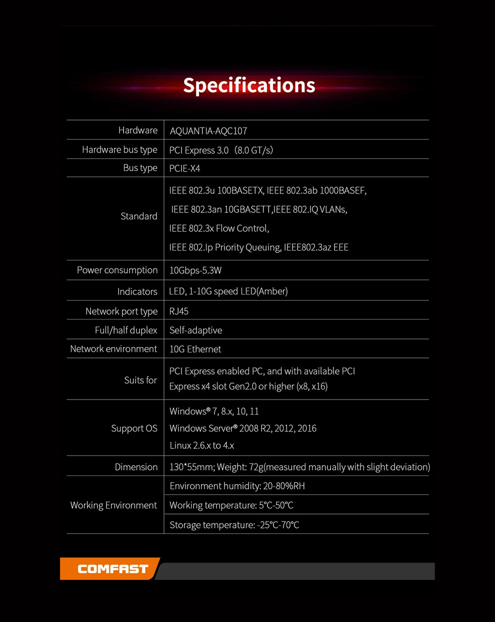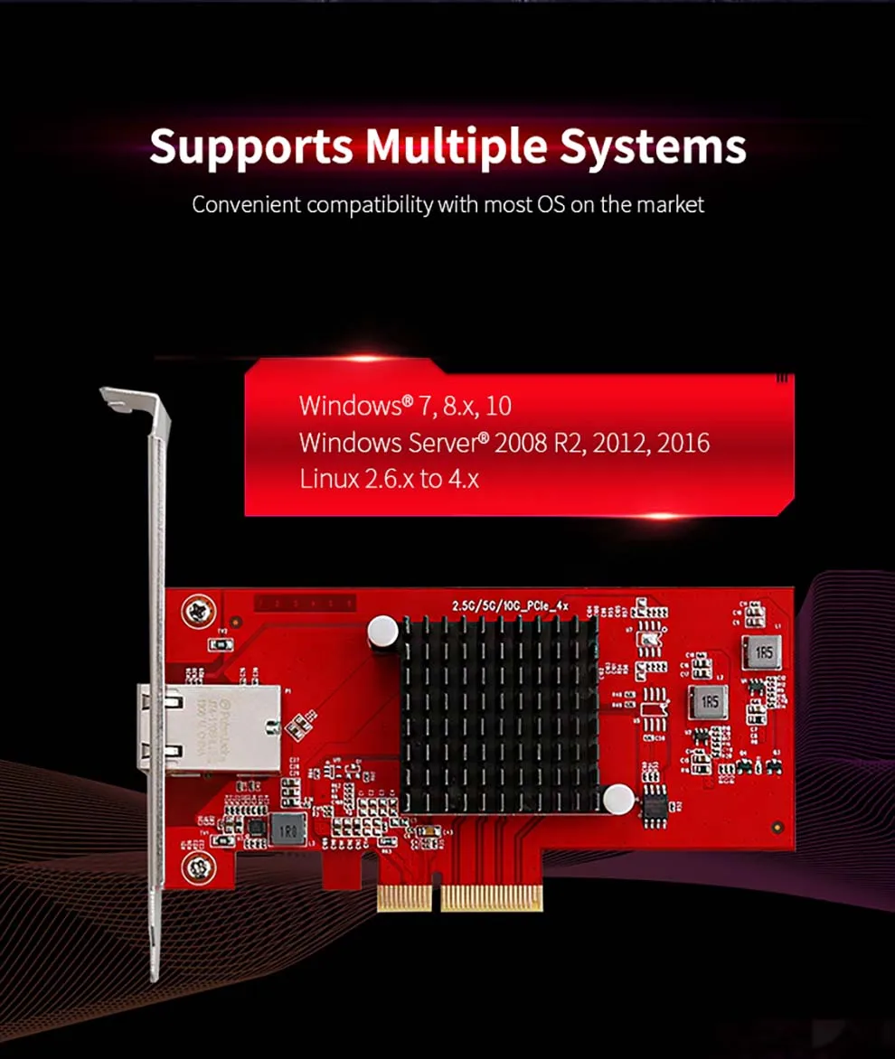 4. Support 10G/5G/2.5G/1G/100Mbps full-duplex and half-duplex adaptive. Transmission speeds up to 10Gbps, provide10Gbps network access for Computers