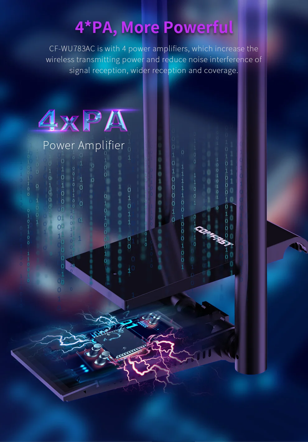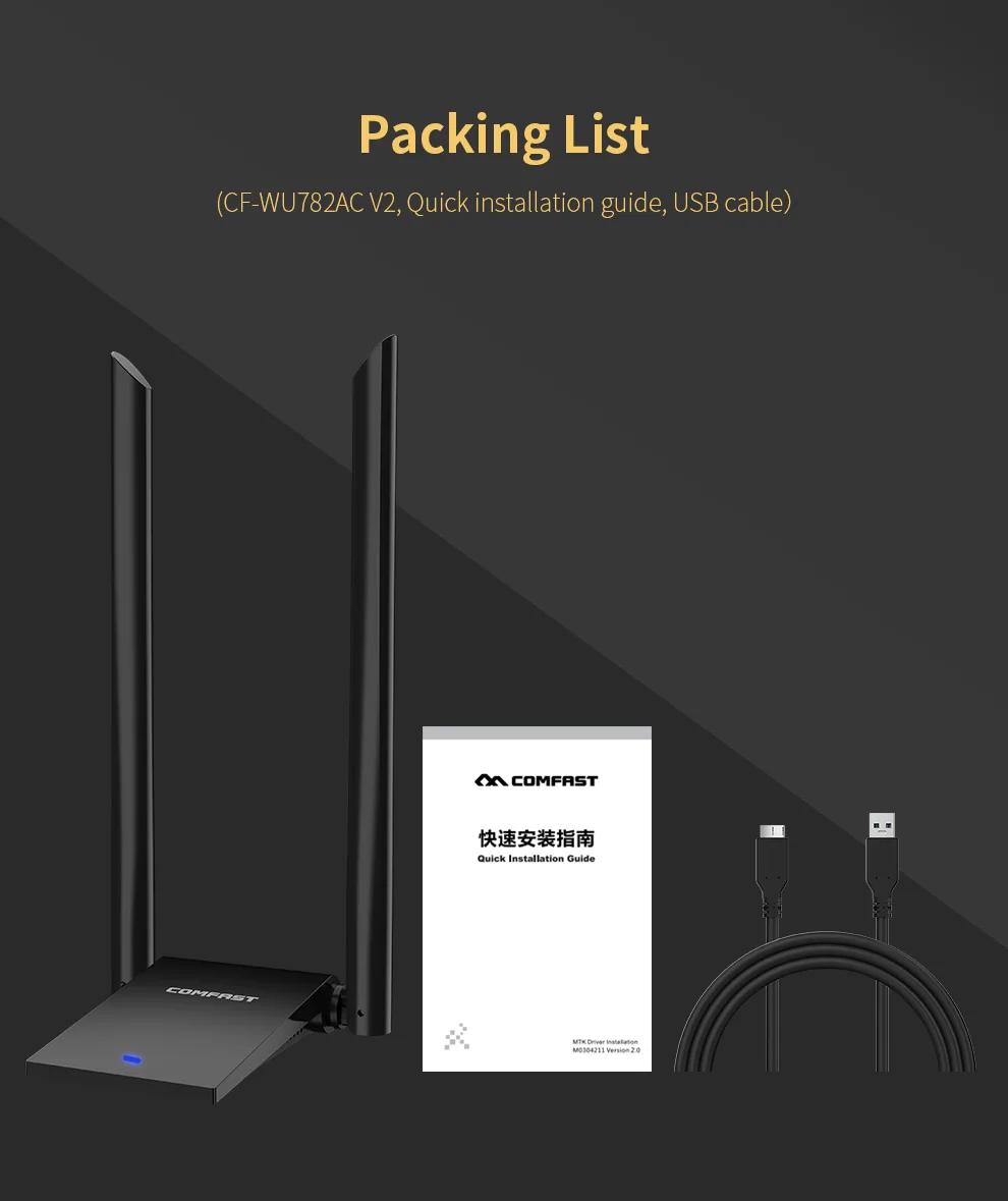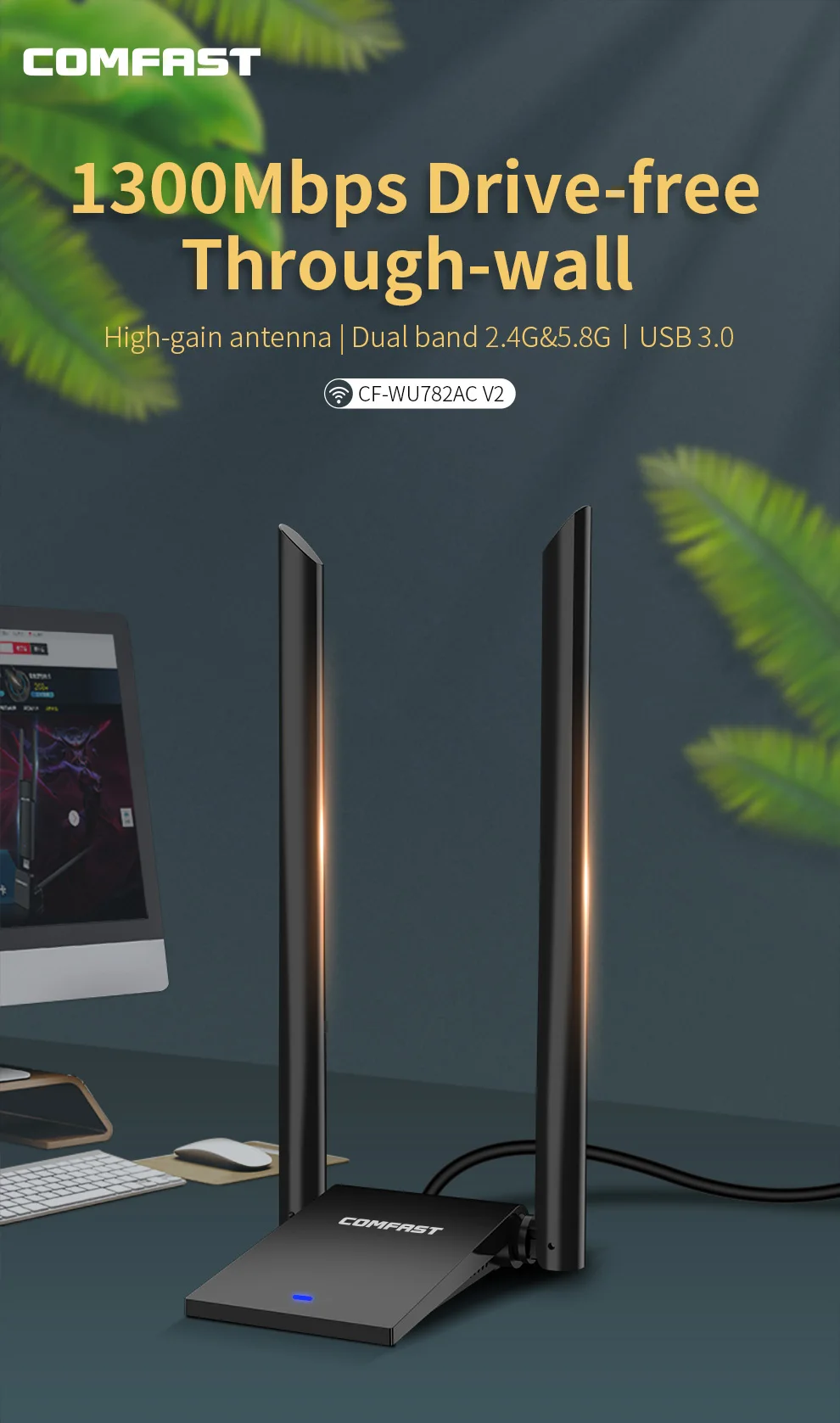 CF-WU782AC:Chip MT7612UNUnidad gratuita1300Mbps doble banda USB3.0Adaptador WiFi con antena de 2 * 6dBi y cable extendido de 1,2 M