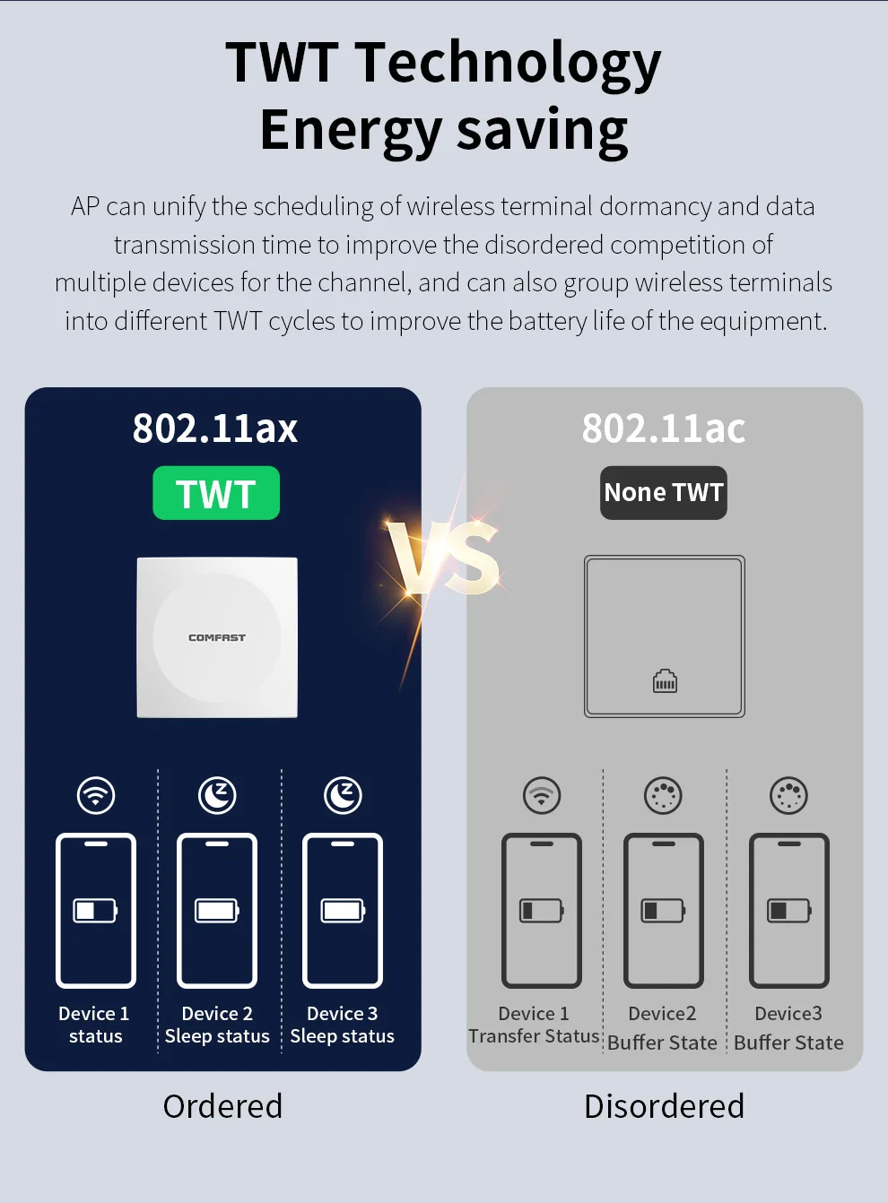 AP puede unificar la programación de la inactividad del terminal inalámbrico y el tiempo de transmisión de datos para mejorar la competencia desordenada de múltiples dispositivos para el canal, y también puede agrupar terminales inalámbricos en diferentes ciclos TWT para mejorar la duración de la batería del equipo.