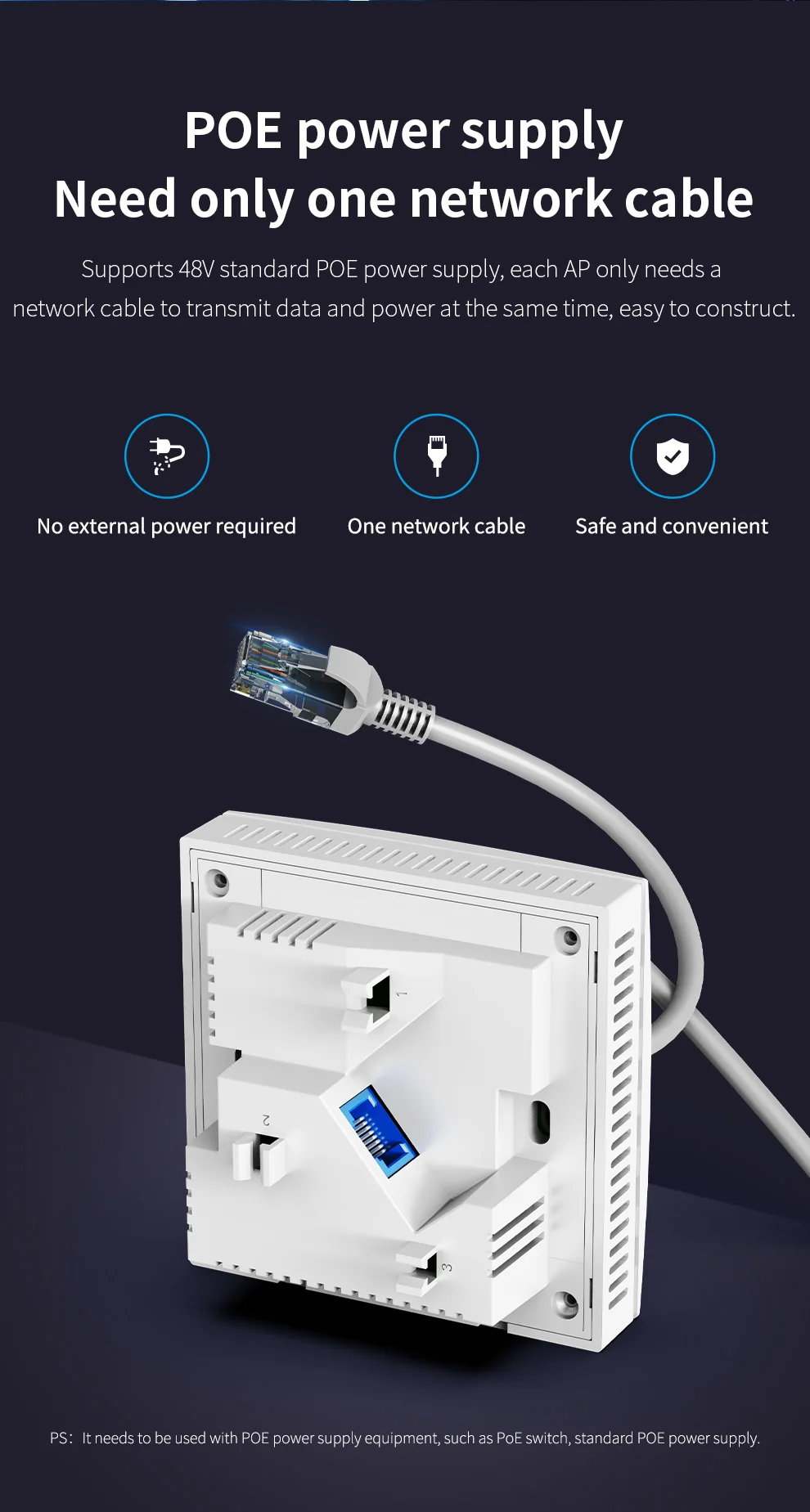 Admite fuente de alimentación POE estándar de 48 V, cada AP solo necesita un cable de red para transmitir datos y energía al mismo tiempo, fácil de construir.