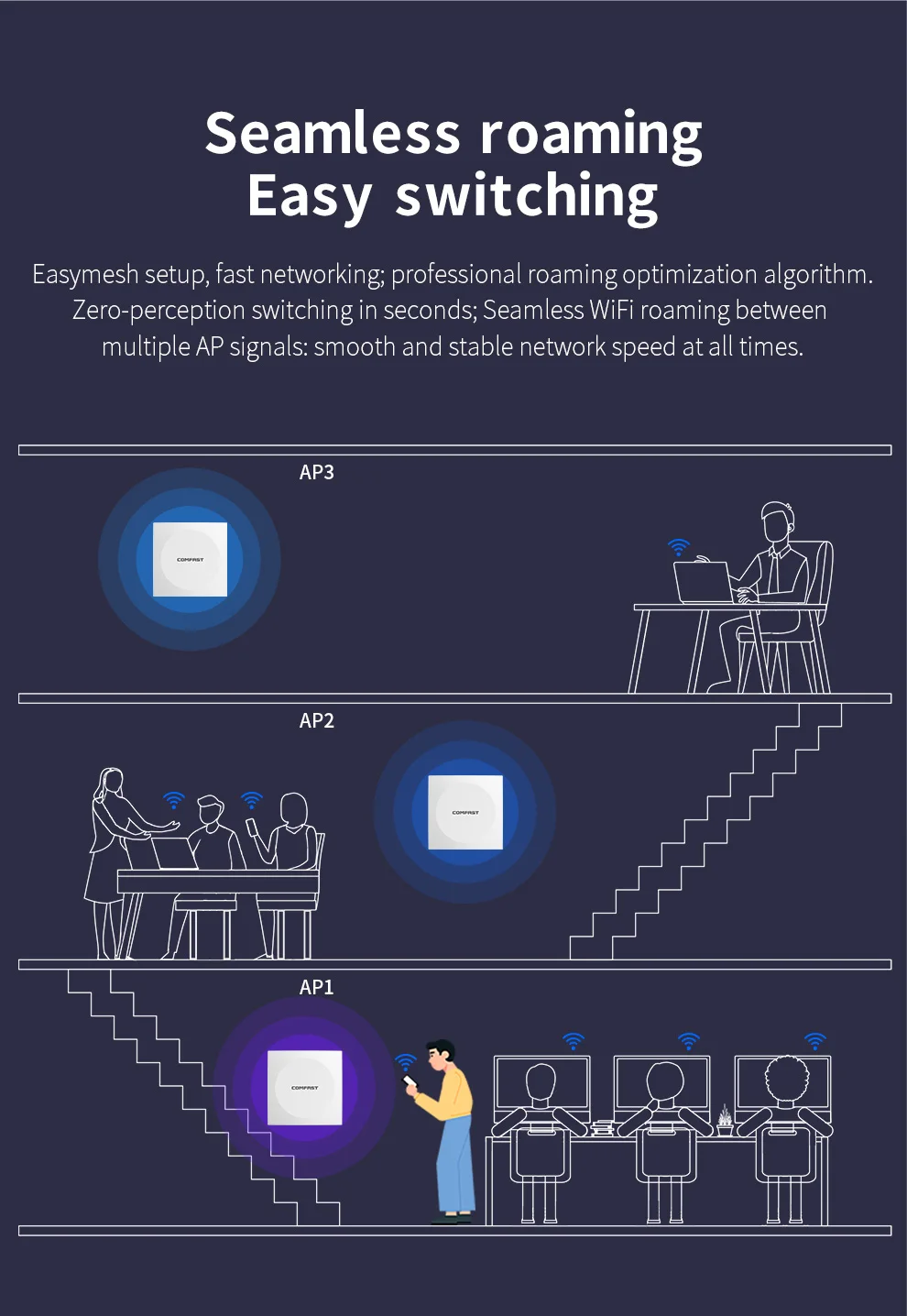 Configuración fácil, conexión en red rápida; Algoritmo de optimización de roaming profesional. Conmutación sin percepción en segundos; Roaming WiFi sin interrupciones entre múltiples señales AP: velocidad de red fluida y estable en todo momento.