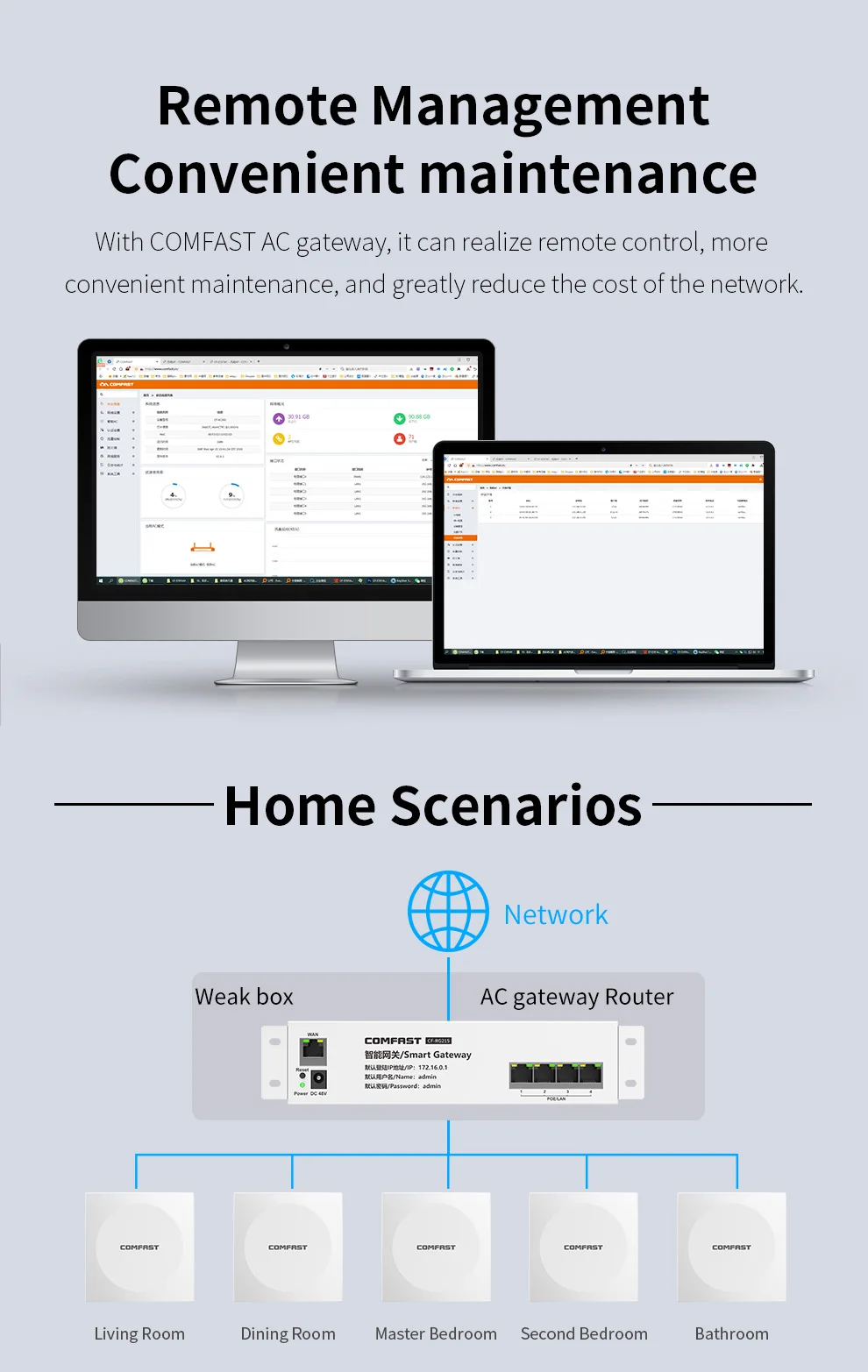 Con la puerta de enlace COMFAST AC, puede realizar control remoto, mantenimiento más conveniente y reducir en gran medida el costo de la red.
